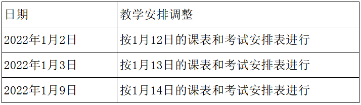 2.从2022年1月2日开始,行课、考试调整安排为下表,行课和考试教室不变:
