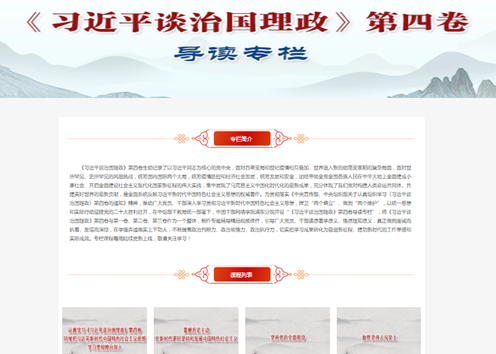 中国干部网络学院《习近平谈治国理政》第四卷导读专栏。专栏课程共22门,其中总论1门,对全书进行内容概述和系统导学;分论21门,对照《习近平谈治国理政》第四卷的21个专题逐一讲解。