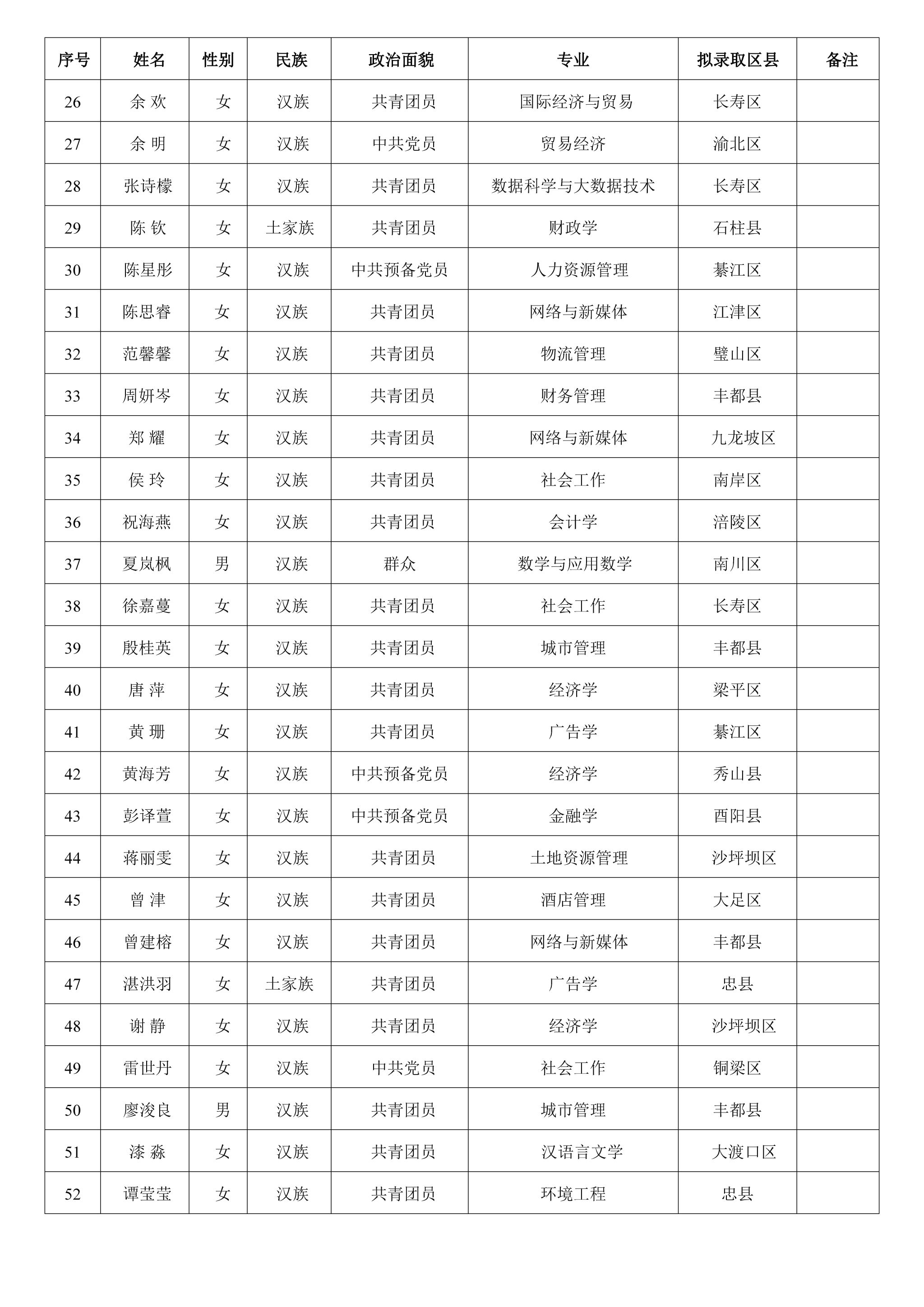 按照重庆市西部计划项目办的统一部署和安排,经学生本人报名、各学院推荐、校团委审核、重庆市各区县项目办招募考核等环节,根据6月5日市项目办反馈情况,现将我校2024年赴市内参与西部计划服务拟录取名单公示如下:(共52名,按姓氏笔画为序排列)