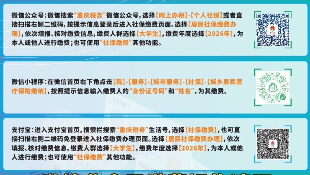 按照《国务院办公厅关于健全基本医疗保险参保长效机制的指导意见》(国办发〔2024〕38号)和《国家发展改革委办公厅等关于进一步提高高校学生医疗保障质量的通知》(发改办就业〔2024〕1096号)有关要求,根据重庆市医疗保障局、重庆市教育委员会、重庆市财政局、国家税务总局重庆市税务局联合发布的《关于做好大学生参加基本医疗保险相关工作的通知》(渝医保发〔2024〕31号)文件精神,为进一步做好我校学生的医疗保障工作,现将2026年大学生参保政策解读如下: