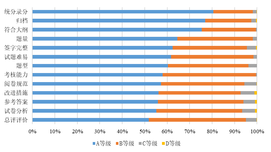本次检查采用现场集中方式进行,参与的校级督导共33名,抽查了18个学院354份毕业论文(设计),覆盖所有本科专业;抽查了全校19个教学学院426袋试卷,共计25100份试卷,涉及356门课程。对毕业论文(设计)主要从选题、论文(设计)质量、教师指导、答辩和成绩评定五个方面进行了检查和评价;对试卷主要从试卷命题、适应程度、试卷评阅、试卷分析和试卷管理五个方面进行了检查和评价。