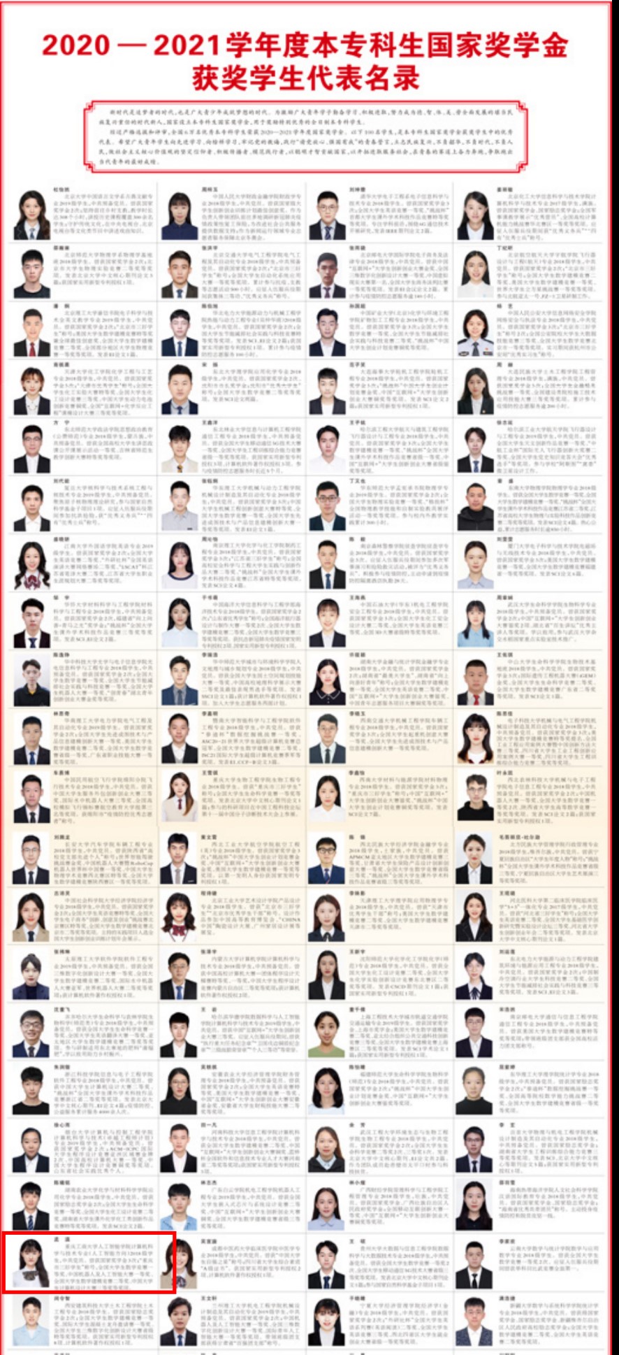 教育部每年评选出100名国家奖学金获奖学生优秀代表进行刊登展示,以此激励全国广大青年学生以他们为榜样,认真学习、积极进取, 努力成为堪当民族复兴重任的时代新人。