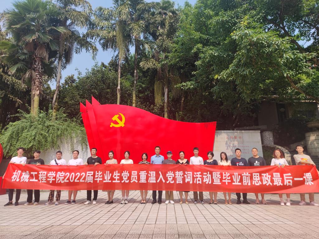 为扎实推进党史学习教育常态化长效化,进一步加强大学生党员的理想信念和党性教育,激励毕业生党员立足岗位、勇于担当,6月20日,机械工程学院举行2022届毕业班本科生、研究生党员代表重温入党誓词活动暨毕业前思政最后一课。学院党委书记杨娟、副书记陈春洁、学生党支部书记和毕业生党员代表参加了活动。
