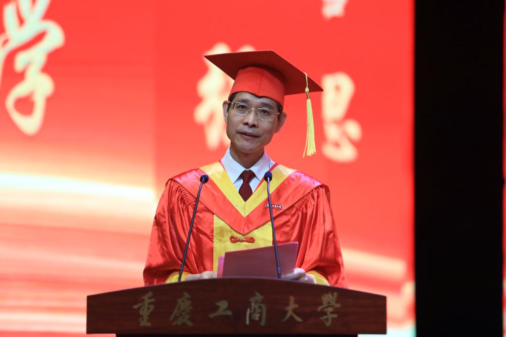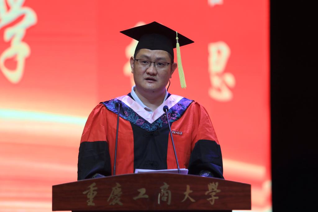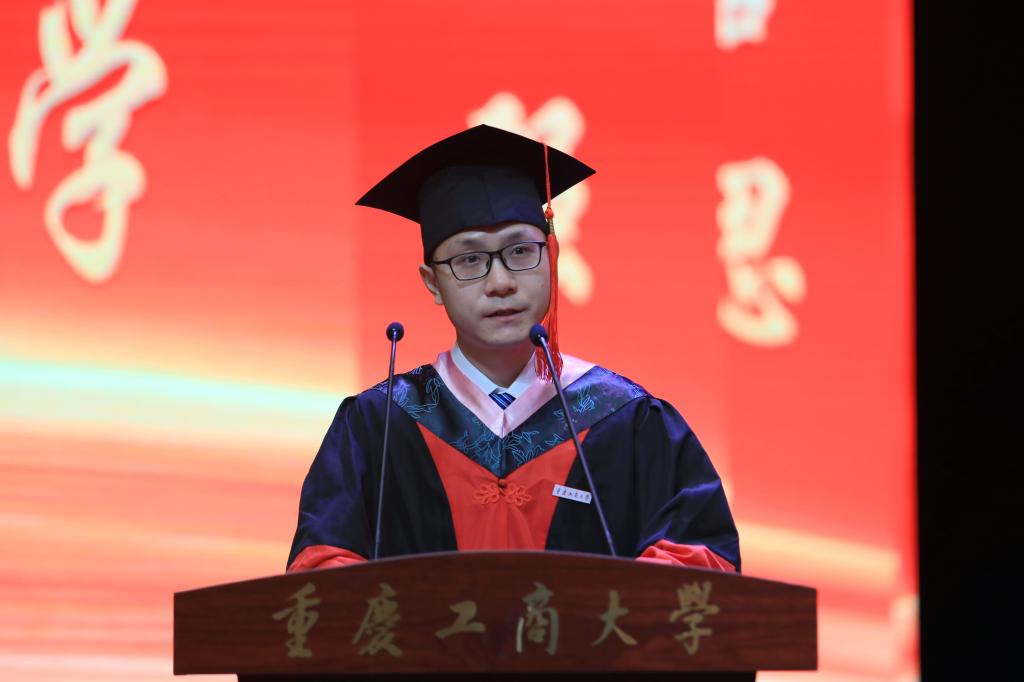 离别之际,诉衷肠。毕业生代表2018级博士赵柄鉴作为学生代表发表了毕业感言。他饱含深情地细数在母校的呵护与陪伴下收获的快乐与成长,言语之中满是对母校的不舍与感恩。他谈到,今天的毕业典礼,不是庆祝“结束”,而是欢呼“成长”;不是纪念“完成”,而是宣告“进步”。他借用习近平总书记对青年学子的寄语,勉励学弟学妹们“不负韶华,不负时代,不负人民,在青春的赛道上奋力奔跑,争取跑出当代青年的最好成绩”。