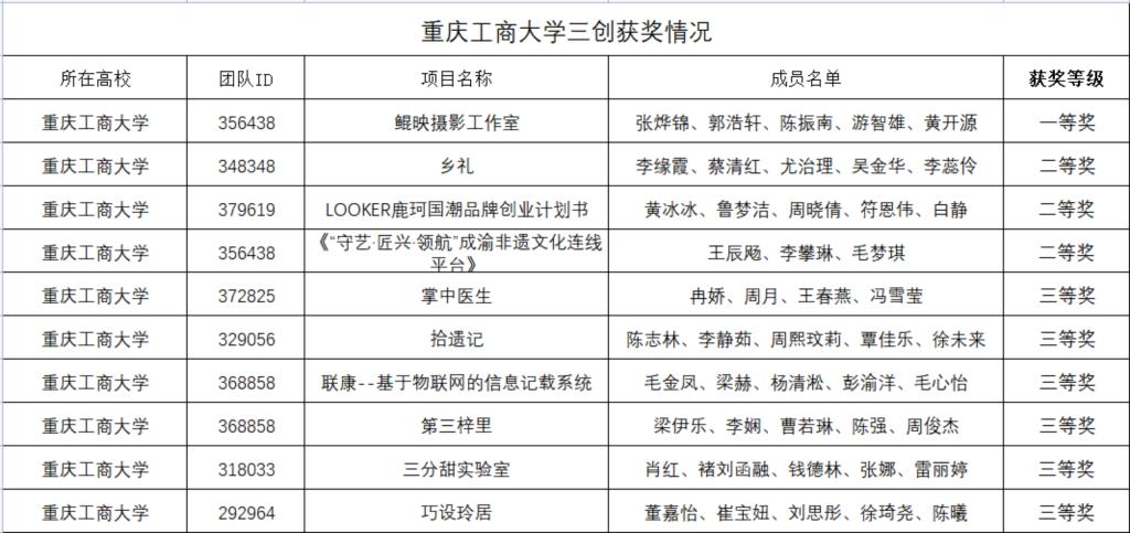 三创赛在我校选拔阶段由管理科学与工程学院学生组织管理管理科学与工程研究会承办。我校共有86支队伍参与选拔,经过重重筛选,共计14支队伍代表我校进入此次重庆赛区选拔。最终共有1支团队荣获一等奖,3支团队荣获二等奖,6支团队获得三等奖。
