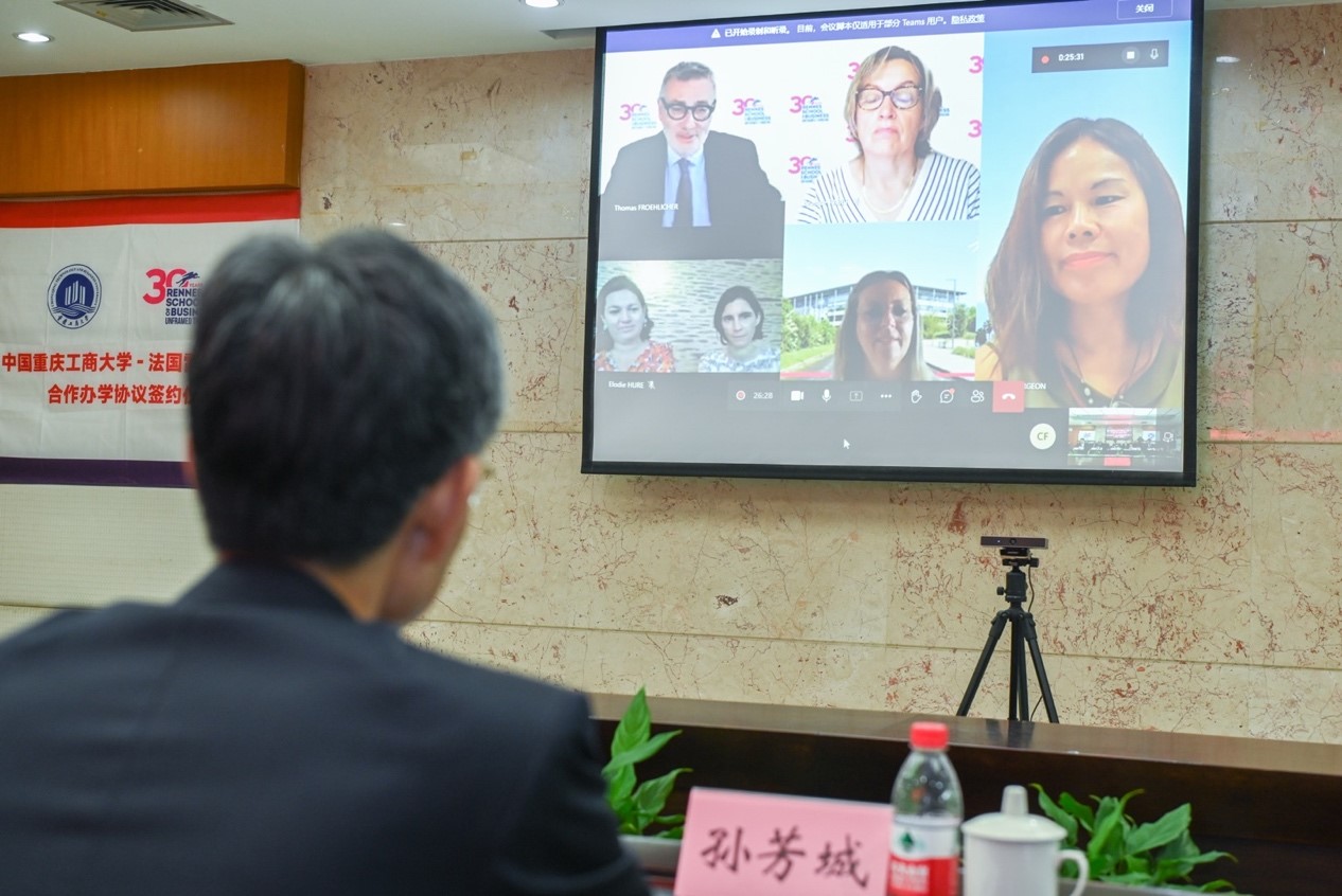 2022年6月18日下午,在学校隆重庆祝建校70周年期间,乐鱼在线登录和法国雷恩商学院合作协议签约仪式以视频方式在学校厚德楼3019会议室成功举行。仪式由学校国际处处长张轶主持。学校校长孙芳城、副校长柏群,国际处负责人、国际商学院班子全体成员及相关部门负责人,雷恩商学院校长Thomas FROEHLICHER、主管副校长和国际处负责人、项目负责人等,出席了签约仪式。