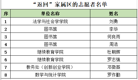 本轮疫情发生以来,我校近500名教职工积极响应学校号召,迅速回到工作岗位,投身到疫情防控工作中。其中,有多名来自南岸校区家属区的教职工,主动请缨,常住办公室战“疫”办公,参与志愿服务。近日,我校南岸校区教职工家属区陆续发现4例核酸检测阳性感染者,为保障该区域内1000余名教职工、研究生、本科生、居民及租户、往届毕业生等相关人员的日常生活和核酸检测等需要,8名从教职工家属区“出来”的志愿者服从学校安排,又请缨返回教职工家属区,参加志愿服务工作。