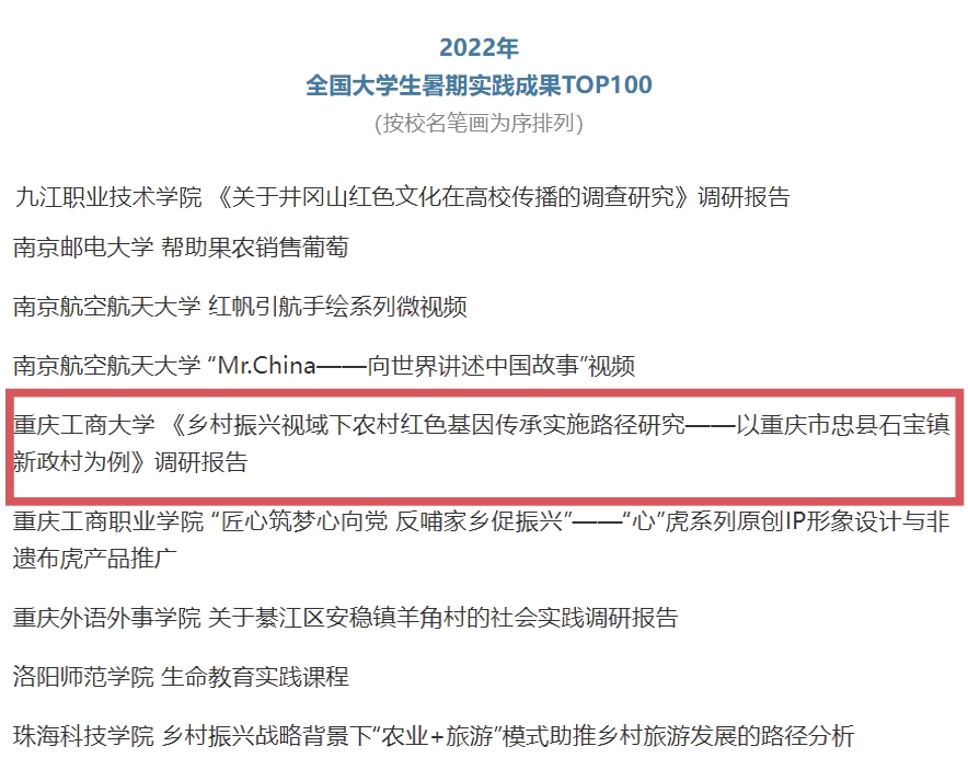 近日,由中国青年报社开展的2022年第八届全国大学生暑期实践展示活动评选结果揭晓,我校通识学院聚焦“‘大思政’:铸民族同心,促乡村振兴”民族团结实践团完成的《乡村振兴视域下农村红色基因传承实施路径研究——以重庆市忠县石宝镇新政村为例》调研报告,经校方推荐、团队自荐、网络展示等环节,入选2022年全国大学生暑期实践成果百强榜单。