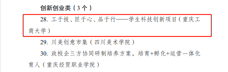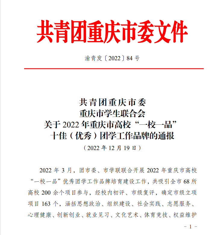 近日,共青团重庆市委、重庆市学生联合会发布了关于2022年重庆市高校“一校一品”十佳(优秀)团学工作品牌的通报,我校管理科学与工程学院社会实践类项目 《“小云雀”助农实践育人项目》、机械工程学院创新创业类项目 《“工于技、匠于心、品于行——学生科技创新项目》荣获优秀团学工作品牌奖。