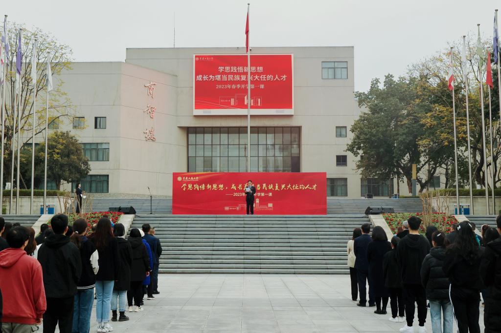 为认真落实重庆市教委关于做好“开学第一课”的相关工作要求,弘扬以爱国主义为核心的伟大民族精神,引导广大青年学生爱党爱国,勤奋笃学,以良好的心态和积极的精神面貌投入新学期的学习生活,3月6日,我校在南岸校区含弘广场隆重举行新学期升国旗仪式,学校党委书记李志雄为学生代表上“开学第一课”。