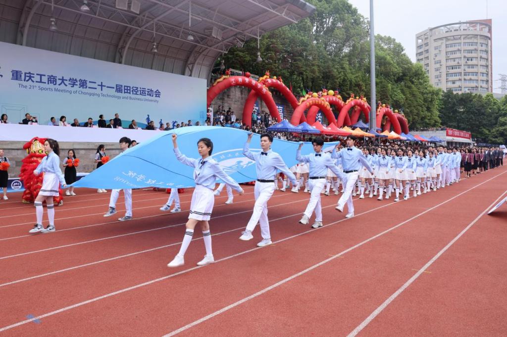 通识学院带来百人啦啦操《青春追梦人》。他们手上花球翻转,脸上洋溢着自信的笑容,用音符跳出青春的旋律,将舞步融入追寻的梦想,随着队形的变换,跑道上出现“CTBU”的字样,释放出了重工商大学子的青春能量。