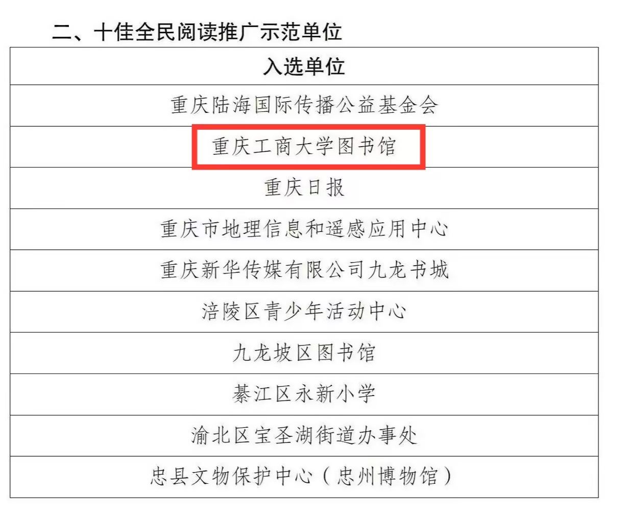 在2023年“书香重庆”全民阅读系列推荐活动中,乐鱼在线登录图书馆凭丰富多彩的阅读活动、优化阅读环境、推广数字化阅读、参与社会文化公益活动等方式,不但吸引了众多在校师生参与阅读、营造书香校园等方面做出了显著成绩;也在社区文化活动和社会文化公益等方面展现了其大学人文情怀。本次成功获评“十佳阅读推广示范单位”不仅是对我校图书馆长期以来致力于阅读文化建设的肯定,也是对我校图书馆在推动全民阅读工作中所发挥的示范引领作用的认可。