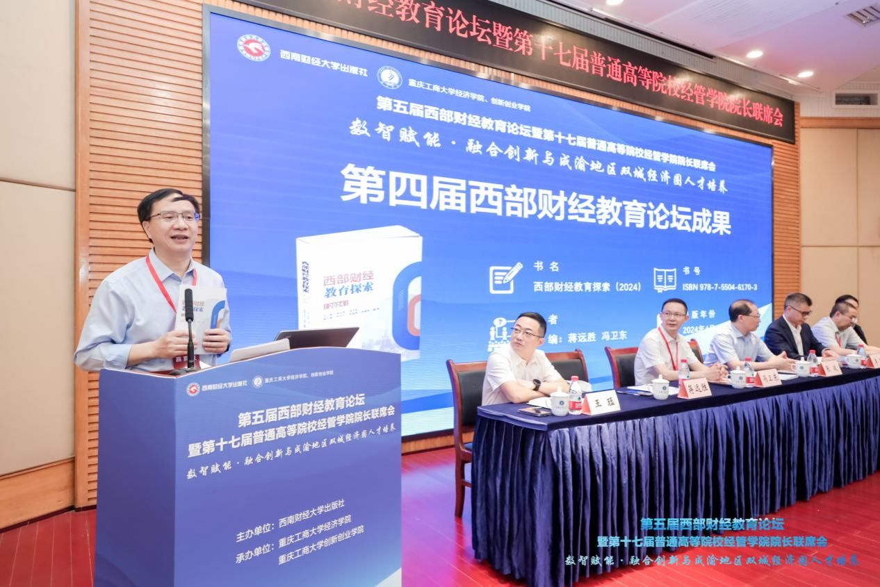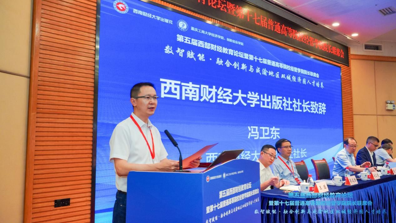 西南财经大学出版社社长冯卫东致辞。他介绍了出版社在学术著作出版、教材出版、图书质量等方面始终把“服务高校、服务作者”作为重要任务及使命。他希望,未来出版社愿在“数智赋能、融合创新与成渝地区双城经济圈人才培养”方面与参会人员一起贡献智慧、共创价值。