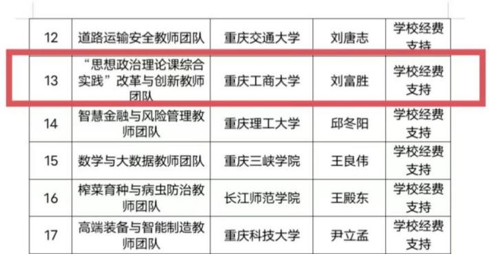 近日,重庆市教育委员会公布了第五批重庆市高校“黄大年式”教师团队名单。我校马克思主义学院刘富胜教授领衔的“思想政治理论课综合实践”改革与创新教师团队成功入选。