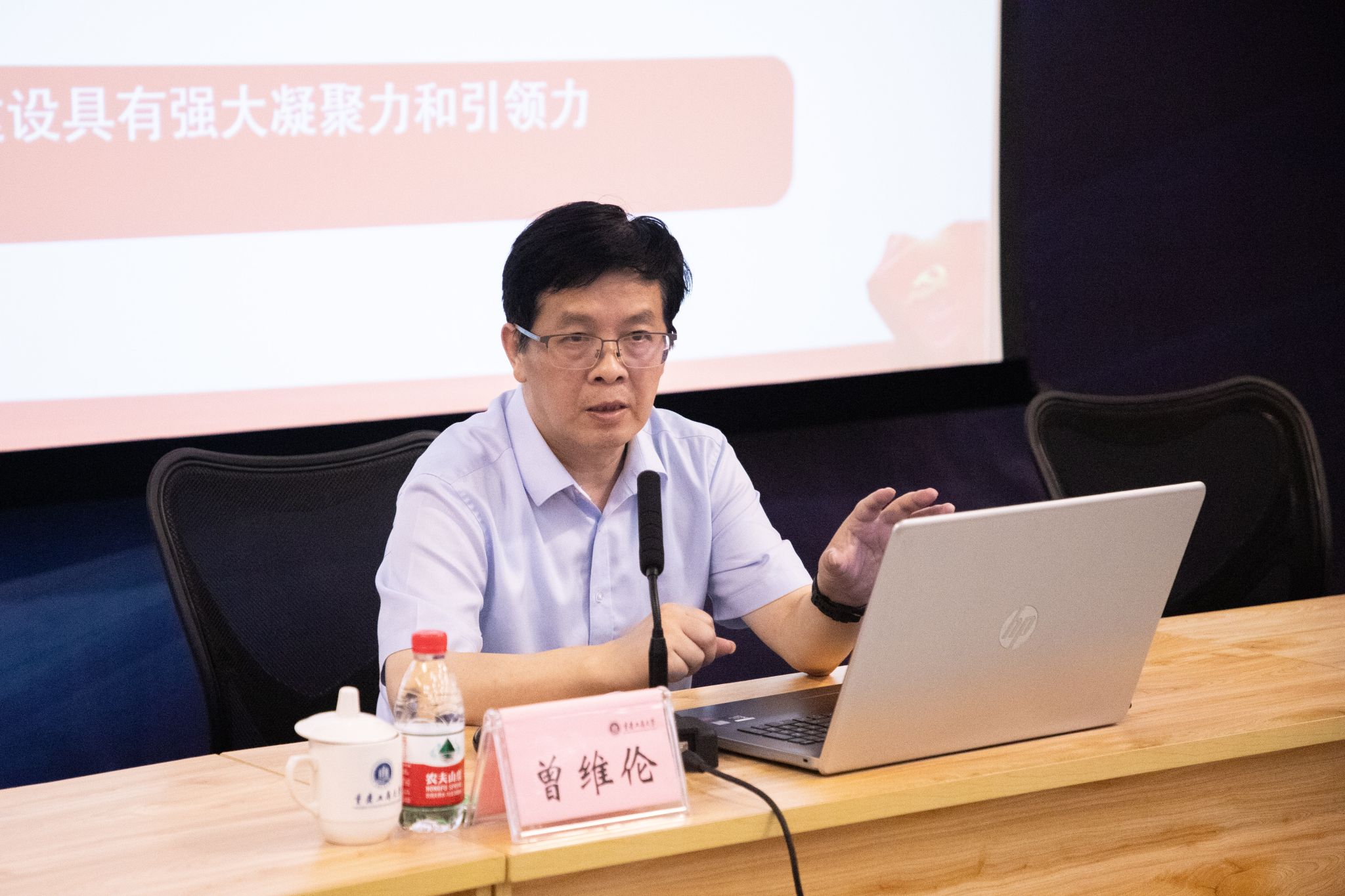 学校党委书记曾维伦教授以“建设具有强大凝聚力和引领力的社会主义意识形态”为题,从站在维护国家政治安全、政权安全的战略高度,深刻认识意识形态工作的极端重要性;深学笃用习近平总书记关于意识形态工作的重要论述精神,牢牢把握做好意识形态工作的根本遵循;深刻把握当前意识形态领域的新形势新挑战,增强做好意识形态工作的责任感和使命感;压紧压实责任,着力建设具有强大凝聚力和引领力的社会主义意识形态等四个方面,向大家作了深入浅出的讲解。他强调,新时代新征程,我们要持续巩固发展意识形态领域良好态势,加快建设具有强大凝聚力和引领力的社会主义意识形态,为向第二个百年奋斗目标进军提供强大精神力量和坚强思想保证。