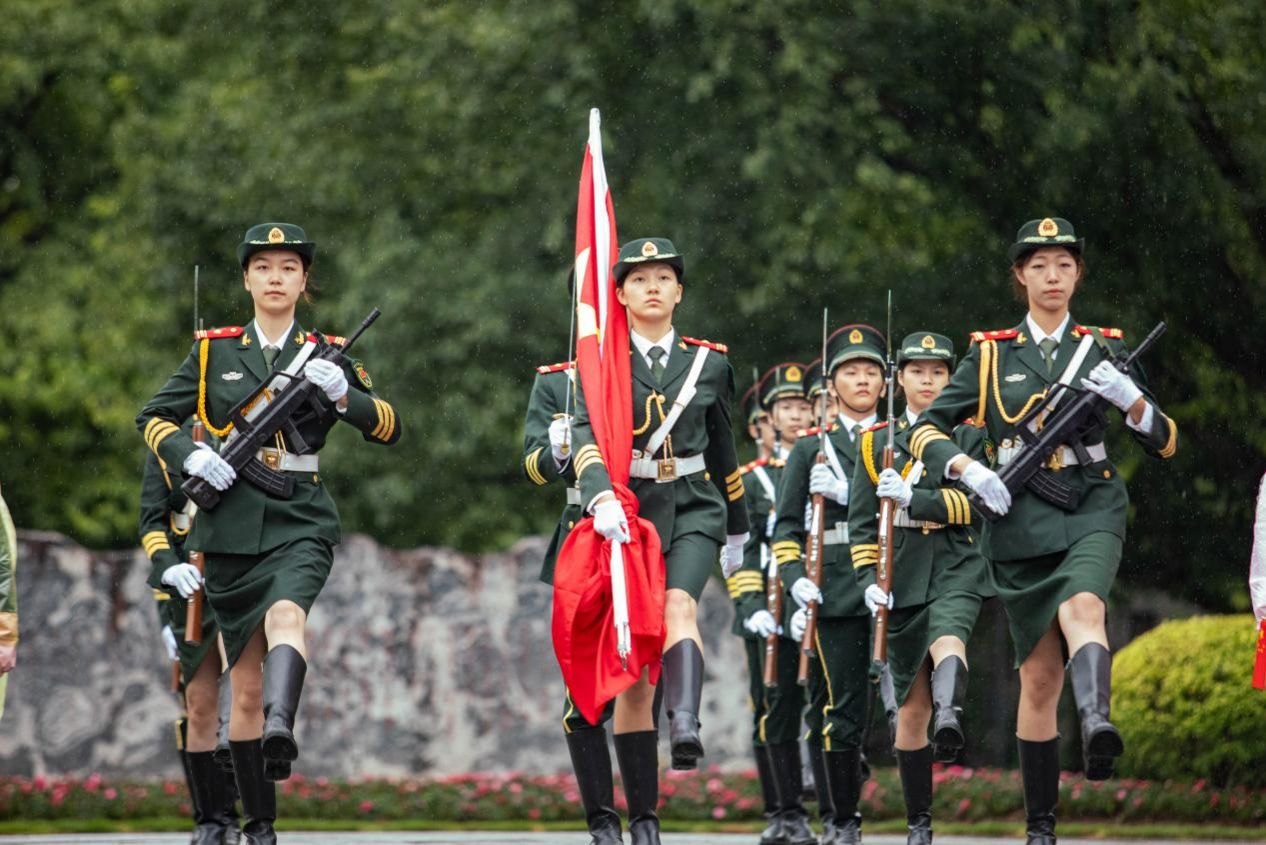 “行注目礼,升国旗,奏国歌!”当雄壮激昂的国歌奏响,升旗手迎风振臂一挥,五星红旗冉冉升起。在场全体师生员工在风雨中肃穆而立,致以注目礼。