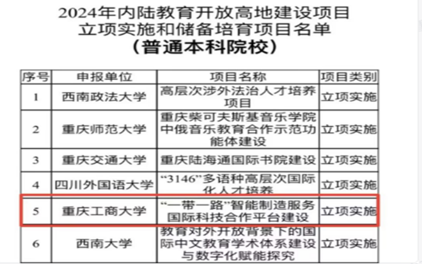 近日,重庆市教育委员会、重庆市财政局公布《2024年内陆教育开放高地建设项目立项实施和储备培育项目名单》,我校“‘一带一路’智能制造服务国际科技合作平台”获批重点项目立项实施。项目建设周期3年,资助总金额500万元。项目依托学校智能制造、智能控制、智能机器人领域在学科、平台和高层次人才等方面的优势,以及前期与“一带一路”国家和地区建立的良好国际科技合作基础,通过三年建设,建成具有全国影响力的“一带一路”智能制造服务国际科技合作平台。