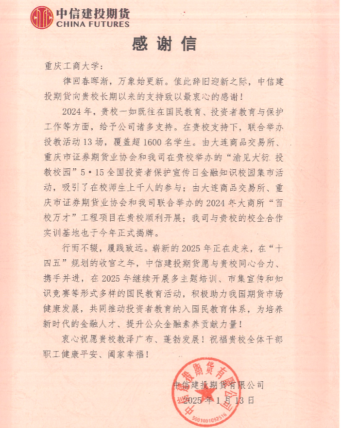 近日,我校会计学院收到来自中信建投期货有限公司的一封感谢信,信中对于学校在国民教育、投资者教育与保护工作等方面给予公司的支持表示感谢。