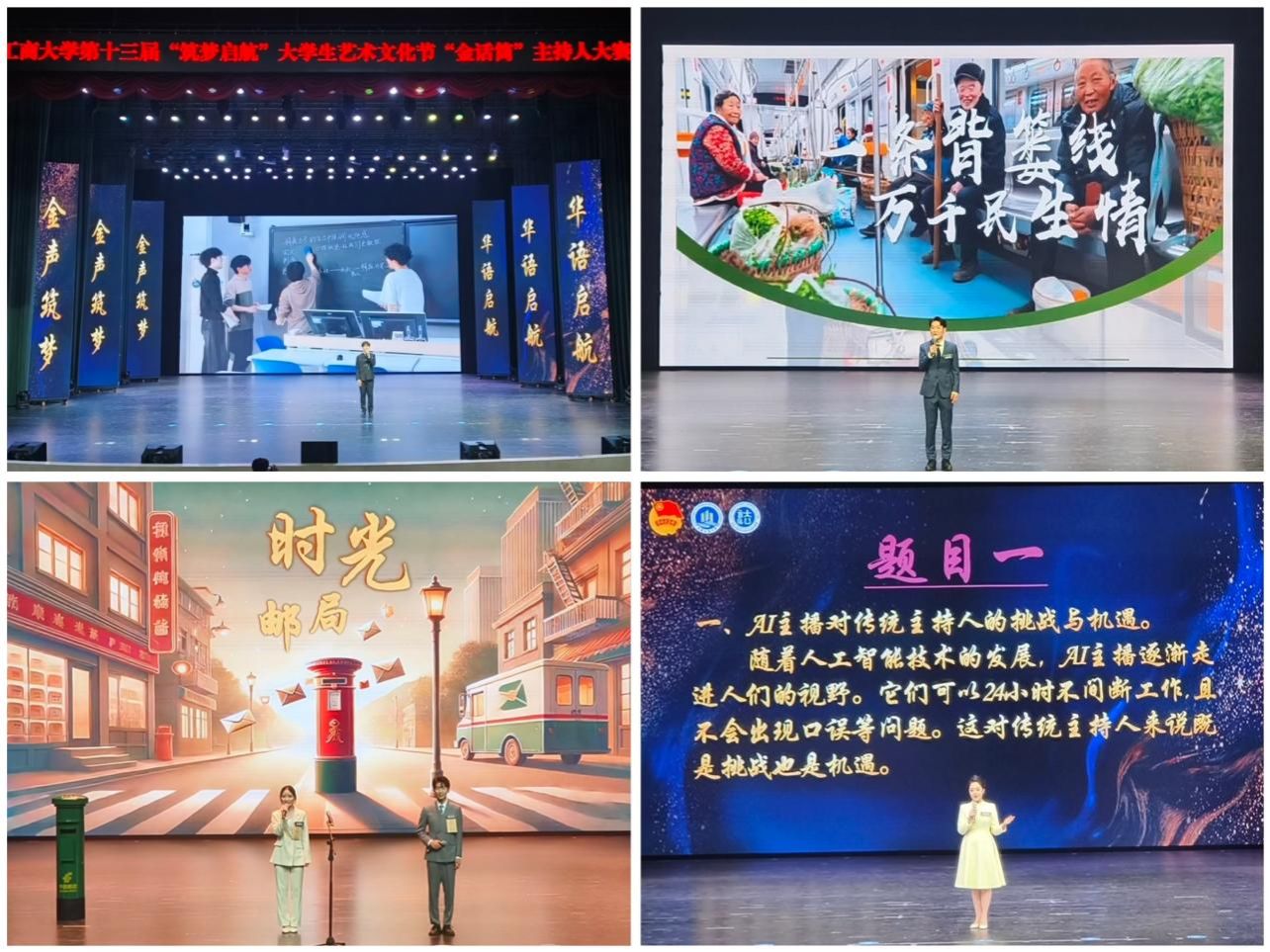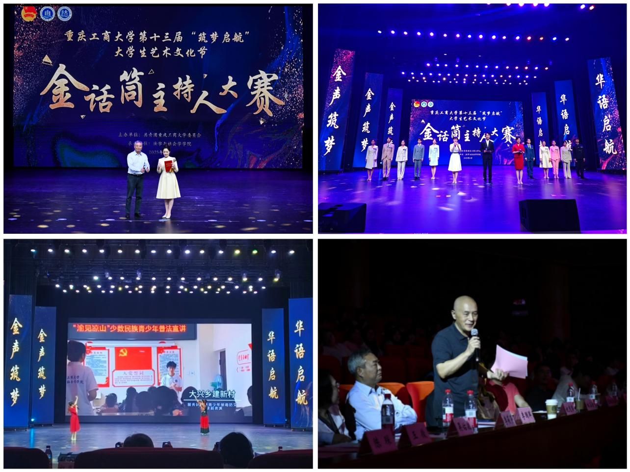 本次比赛共吸引来自15个学院的73名选手报名参赛,经过初赛、复赛的激烈角逐,共有10位选手脱颖而出进入决赛。在十强选手开场朗诵表演《在重工商大为你讲述声音的力量》后,正式开启比赛的三轮环节。第一轮比赛中,参赛选手们通过讲述真实故事,展现其采、编、播三位一体的综合素养。第二轮比赛中,10名选手通过两两组合的方式,依据组合双方共同策划的主题情景进行了模拟主持,将不同主持风格表现得淋漓尽致。最终三强选手经过前两轮的比拼脱颖而出,在第三轮即兴评述环节中随机抽取题目,围绕社会热点与传统文化领域展开即兴表达,展现出卓越的应变能力和清晰的语言逻辑。由法社学院“渝见凉山”团队核心成员带来的歌曲表演《大山》更是将活动氛围推向了高潮。