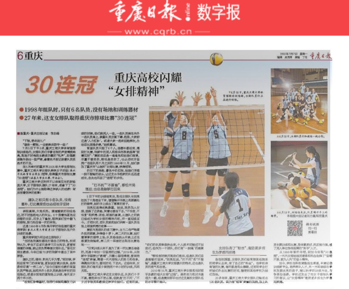 7月7日,重庆日报(数字报)以《“三十连冠”重庆高校闪耀女排精神》为题进行报道;7月6日-7月7日,新重庆APP分别以《视界|“30连冠”!重庆高校也有自己的“女排精神》《“30连冠”!重庆高校也有自己的“女排精神”》为题,对我校女排进行报道。