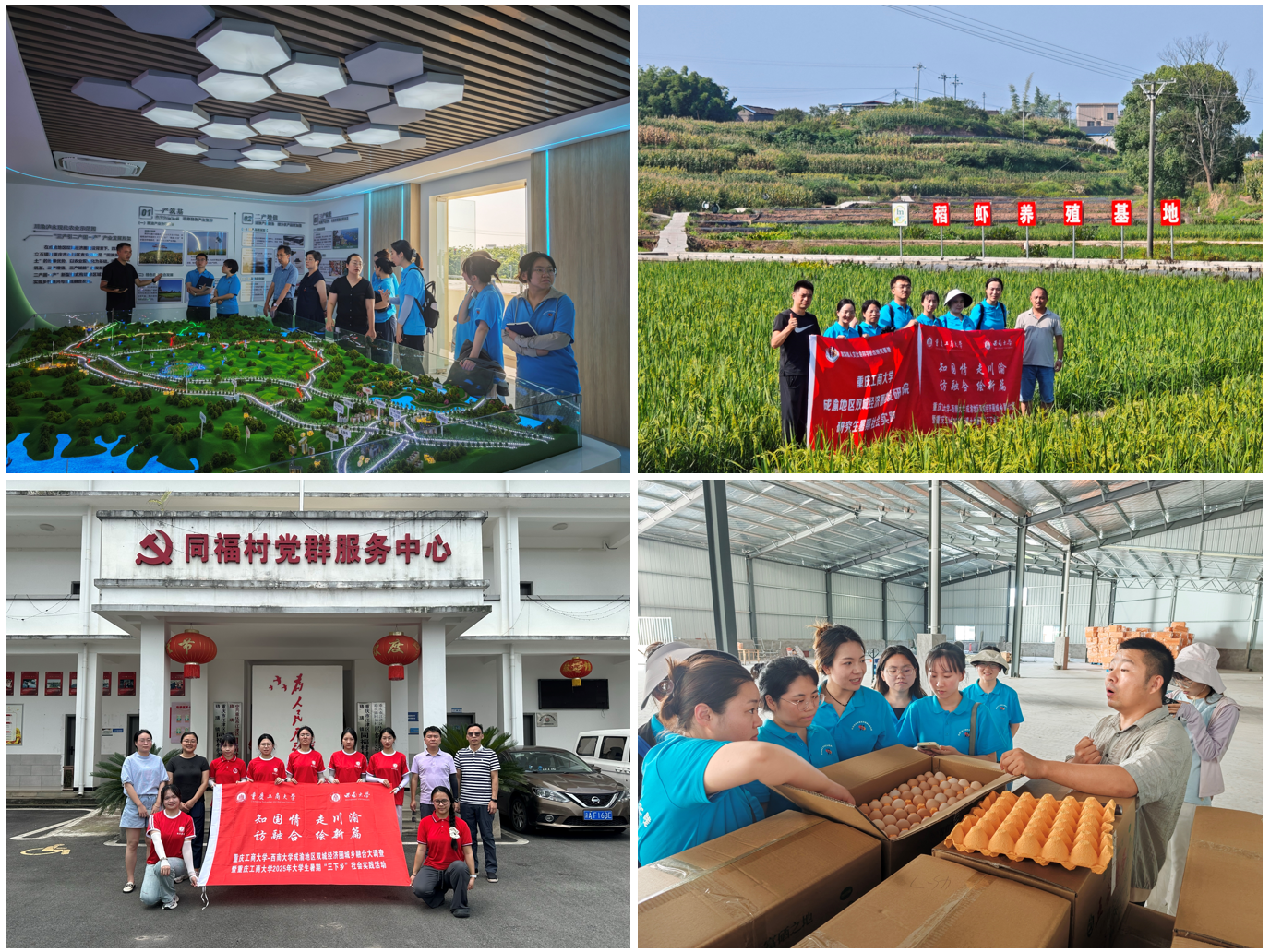 点上深研:精研典型乡镇,剖析融合样本。组建了6支专题案例团队,与暑期大学生“三下乡”活动相结合,赴重庆市荣昌区、江津区、永川区、石柱县,以及四川省成都市东部新区、泸州市泸县等地开展实地调研。聚焦特色农产品产业链带动致富链、村村联合与村企联营、城郊集体经济发展、毗邻区农业协同发展、城乡融合发展的多元主体协同、无人农场与智慧农机等领域,通过“政府访谈+点位观摩+问卷深调”三维联动,系统提炼城乡融合的机制创新与实践经验,形成了一批高质量的调查案例。