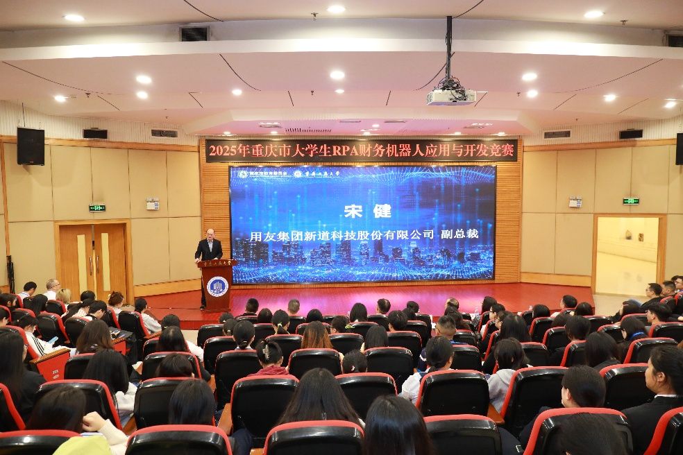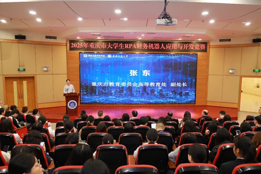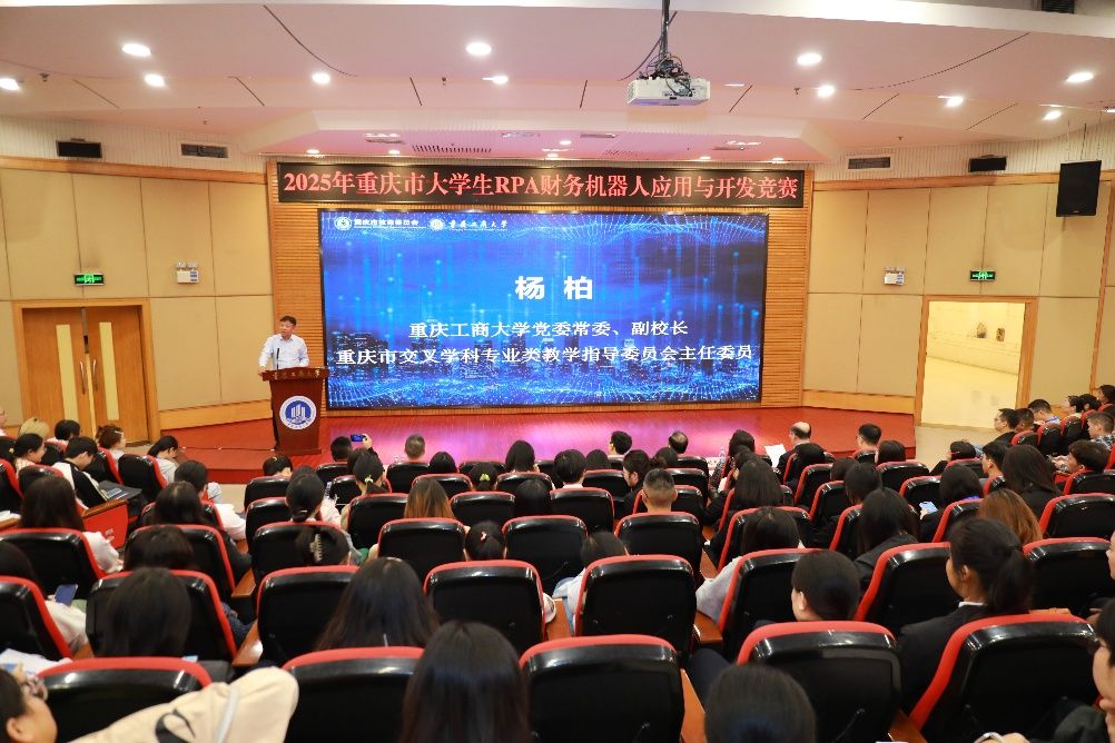 杨柏代表学校对与会领导、嘉宾和全体参赛师生表示欢迎。他系统介绍了我校近年来坚定不移推进“新商科+新工科”深度融合的战略布局。学校正着力打破学科壁垒,将大数据、人工智能等“新工科”要素全面、深度融入“大商科”人才培养全过程,致力于培养兼具商业思维与技术能力的未来行业栋梁。他强调,承办此次RPA竞赛,正是我校“以赛促教、以赛促学、以赛促创”育人理念的生动实践,是检验我校“商工融合”人才培养成效的重要平台,更是我校服务重庆市数字经济发展战略的责任担当。