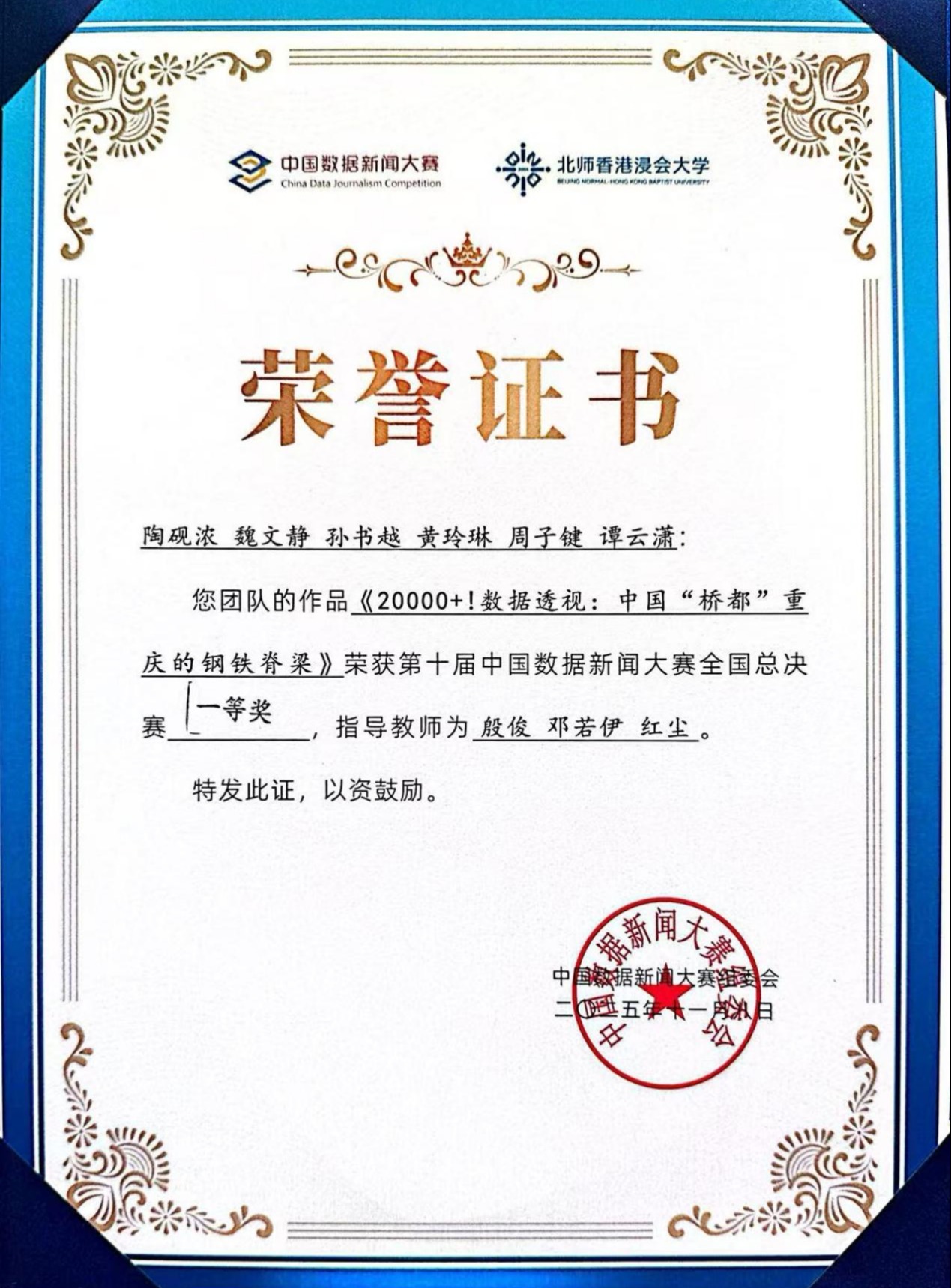 本届中国数据新闻大赛由北师香港浸会大学、西安交通大学新闻与新媒体学院等全国30余所高校联合承办。大赛吸引了包括中国人民大学、复旦大学等在内的33个省份300余所高校参与,共组建1400余支队伍、5500余人次参赛。陶砚浓团队的获奖作品通过对海量数据的分析与可视化呈现,探讨了重庆桥梁建设对城市发展、经济活动和市民生活的影响。