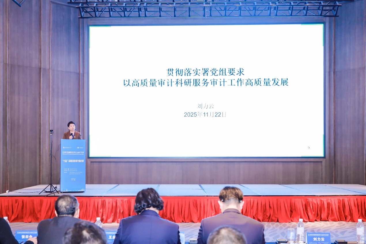 刘力云代表中国审计学会和审计署审计科研所致辞。她指出,学习好贯彻好党的二十届四中全会精神,是当前和今后一个时期全党全国的一项重大政治任务。无论是审计实务工作者,还是审计理论研究人员,都应自觉把思想和行动统一到党的二十届四中全会精神上来,把智慧和力量凝聚到实现全会确定的各项目标和重点工作任务上来,以高质量审计监督促进“十五五”规划落实落地,护航经济社会高质量发展。随后,她以《贯彻落实署党组要求 以高质量审计科研服务审计工作高质量发展》为题作专题报告。