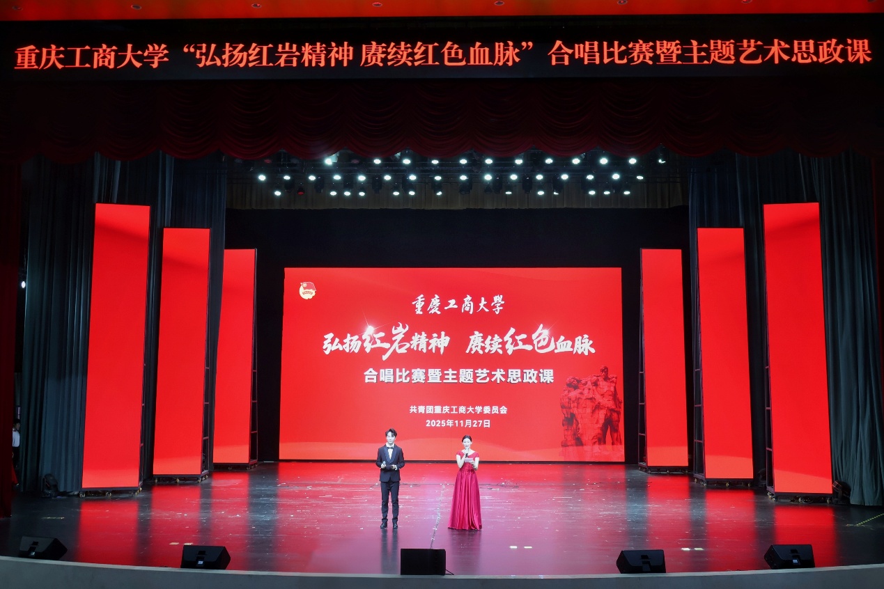 比赛现场,18个学院的学生合唱队齐聚一堂,用歌声致敬革命先烈,让红色血脉在青春接力中赓续传承。活动分为四个篇章。“山河破碎·烽火觉醒”篇章拉开序幕,《松花江上》的悲怆、《在太行山上》的激昂、《长城谣》的深情与《保卫黄河》的怒吼,再现了民族危亡时刻的抗争和觉醒。“众志成城·保卫家园”篇章中,《五月的鲜花》的号召,《游击队歌》展现智慧,《映山红》期盼黎明,而《啊,朋友再见》与《喀秋莎》唱响守望与向往。随着《延安颂》《东方红》的颂歌,活动进入“胜利荣光·薪火永传”篇章,《英雄赞歌》气壮山河,《唱支山歌给党听》情深意切。在“红岩铸魂·筑梦征程”篇章中,从《没有共产党就没有新中国》的真理强音,到《祖国不会忘记》的无名丰碑,再到《在灿烂阳光下》的感恩奋进,《我们都是追梦人》的青春誓言,最终凝聚于《不忘初心》的庄严承诺。尾声一曲《红梅赞》,以红岩上傲然绽放的红梅意象,将坚贞不屈、斗争到底的红岩精神升华,激励青年学子在新时代的筑梦征程上奋勇前行。