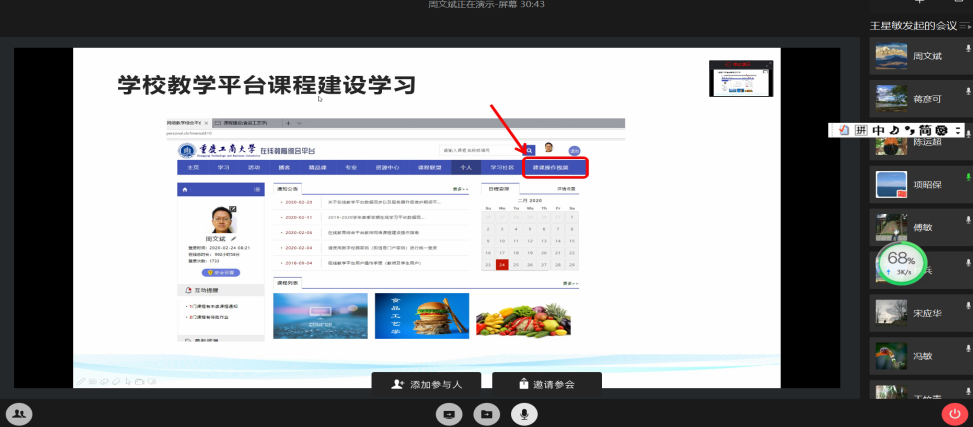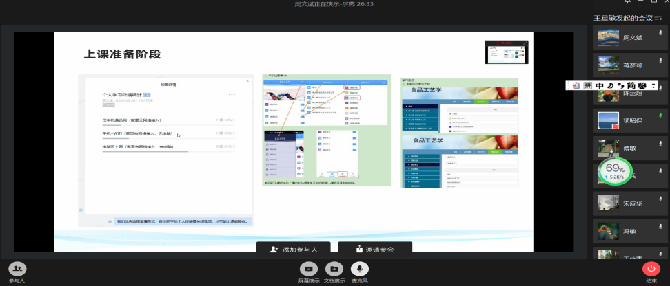 会上,学院王竹青书记强调了在线教学的重要性和学生管理的必要性。傅敏院长以身示教,以《结构化学》课程授课为例,风趣地介绍了在线教学经验,并面向教师提出保障在线教学质量的要求。院督导周文斌老师梳理《食品工艺学》“课前准备、课中互动、课后检查”等授课环节遇到的问题,以PPT形式呈现了开课一周的教学心得及解决问题的方法。杨海林博士分享了解决“在线黑板”的Pointofix软件使用、学生在线学习状态评价监控,并结合《环境系统工程》分享巧用“企业微信平台”的6个技巧。张杰博士分享了《大学化学》在线教学保障教材的3种途径;宋应华教授分享《化学反应工程》的学生打卡管理的做法;吴虹博士分享《环境监测与分析》课程中拉近师生距离的在线教学互动;吴四维老师结合《仪器分析》,解惑老师们利用在线综合平台使用题库等问题;吴佑波副书记介绍了学生管理工作。此外,项昭保教授、唐春红教授、韦晓兰教授、魏星耀教授、屠大伟教授、张会均博士、陈刚博士、方玲博士以及校督导幸宏伟老师、院督导陈盛明老师、王瑞琪老师等六个专业的18位老师先后分享了线教学开课心得,解惑问题,并围绕“如何把控学生在线学习状态、如何保障在线教学质量”开展了积极的讨论,谏言纳策。