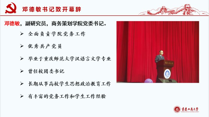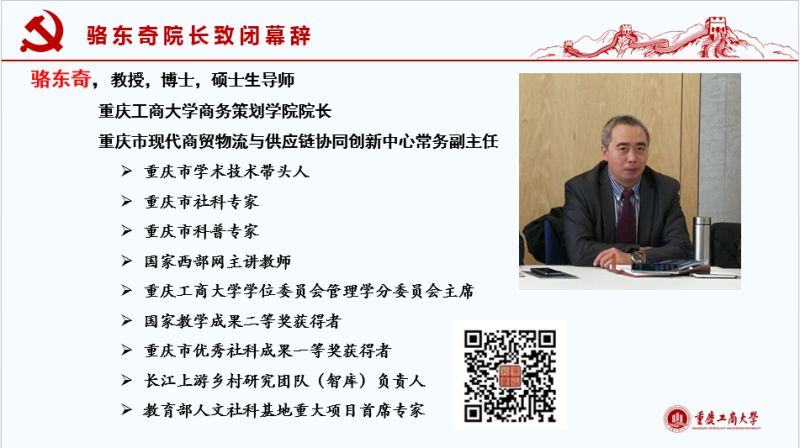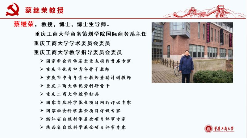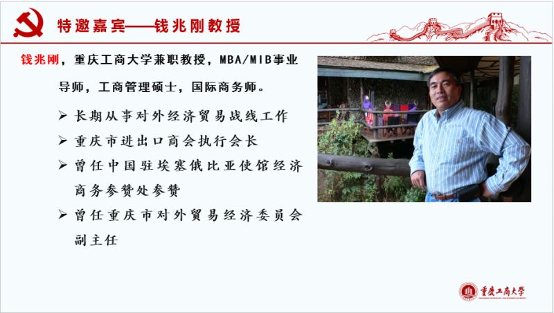 会议中,钱兆刚教授首先以“从工商大学走向国际商务的世界”为题,并从以下几方面进行了演讲:一是分别从对国民作用、对企业作用、对单一国家作用以及对世界作用的视角详细阐释了“国际贸易(商务)很有意思”;二是国际贸易(商务)很有挑战,他以实际案例强调了会说话、懂专业、会为人、讲礼仪、当杂家的重要性。三是“开放的重庆需要你”。重庆作为长江经济带重要节点及“一带一路”倡议的起点,正在积极调整对外结构和打造内陆开放高地,当下对国际商务类专业人才需求量巨大。