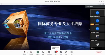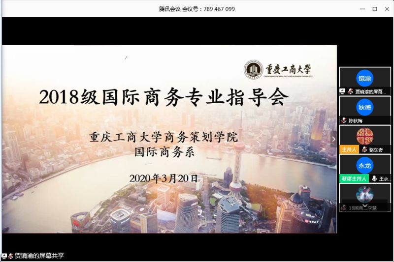2020年3月20日晚,商务策划学院国际商务系通过直播方式举行了“2018级国际商务专业指导会”,学院党委书记邓德敏、院长骆东奇、副院长陈秋梅、特邀嘉宾钱兆刚教授、全体国际商务系教师、2018级国际商务专业学生及部分家长参加了会议。