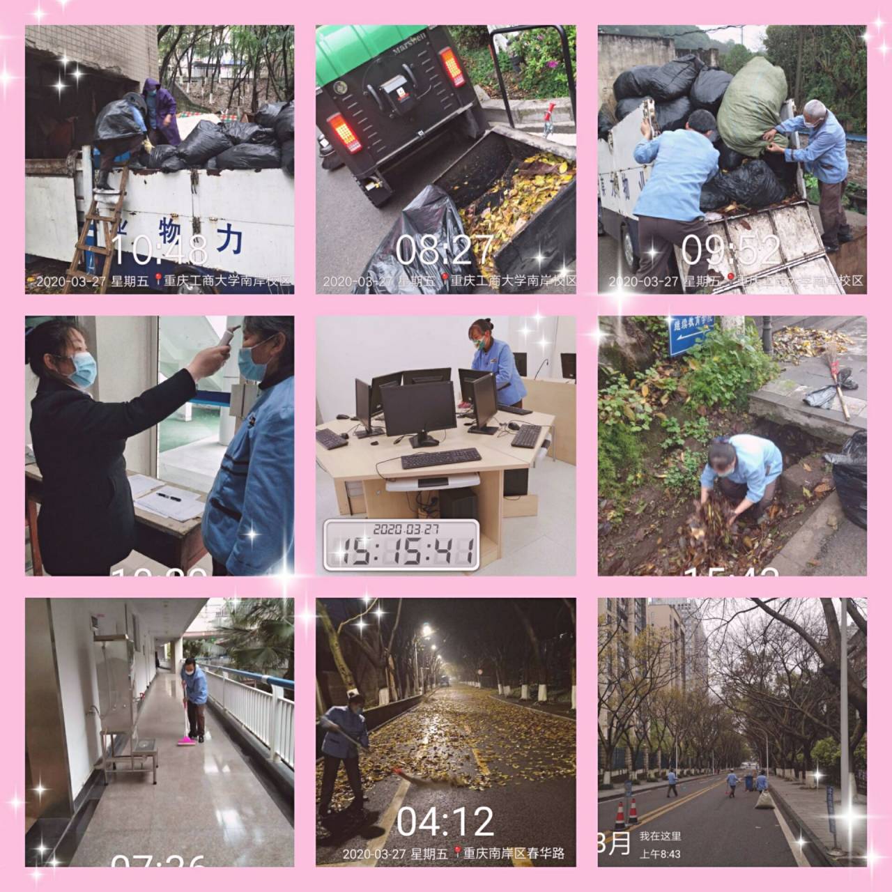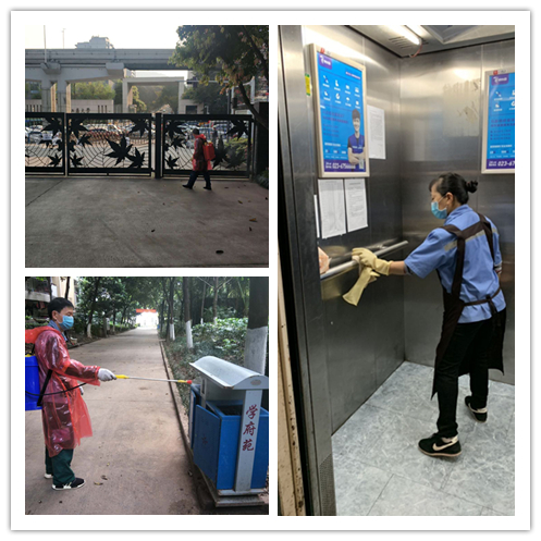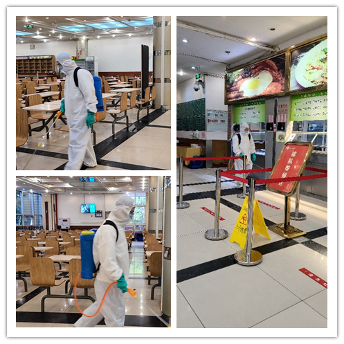 后勤处以疫情防控工作为契机,自3月20日起深入开展爱国卫生运动,对全校教学区、办公区、餐饮区、公寓区、公共生活区及校园周边环境进行大扫除,清理卫生死角和各类垃圾,对公共物品及地面、走廊、厕所、电梯等公共区域定时清扫保洁,营造整洁卫生的校园环境;对各值班点、岗亭、校大门、食堂、教学楼、办公楼、卫生间、电梯、垃圾站(桶)、家属区等进行消毒,切实切断传染病传播途径。