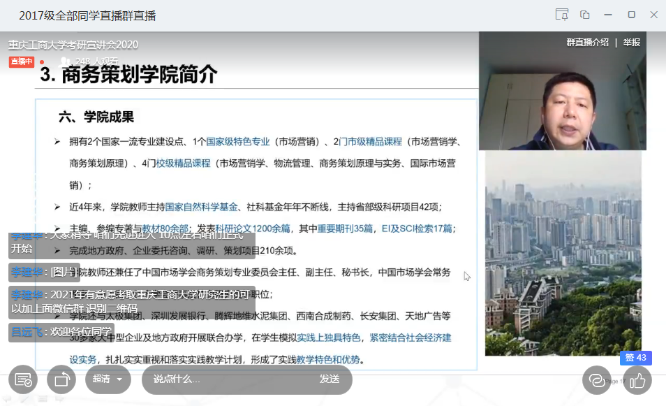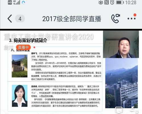 此次宣讲会经过数次与河南师范大学辅导员李建华老师沟通、协调得以如期举行。宣讲会通过钉钉直播的形式进行,河南师范大学商学院2017级、2018级部分未来有意考研的同学共600余人参与了此次直播。詹川首先介绍了重庆作为西部地区唯一的直辖市所具有的地域特点及发展优势,并对乐鱼在线登录的办学规模、研究生师资及研究生培养情况作了简要介绍。接着,詹川详细介绍了商务策划学院企业管理及技术经济及管理学术硕士、国际商务专业硕士的专业设置、办学特点、师资力量、培养模式、学生就业以及奖助体系等情况。随后,学院2017级技术经济及管理专业研究生、河南师范大学校友李肖依同学,分享了她的考研历程及读研期间的个人感悟和收获。此次线上宣讲会还对2021年有意报考乐鱼在线登录硕士研究生的同学们进行答疑解惑,以便同学们更加了解我校,认识当前考研形势,以及制定切实有效的考研计划。