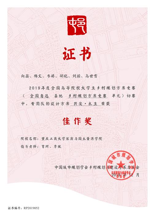 日前,从2019年度乡村发展研讨会暨第三届全国高等院校城乡规划专业大学生乡村规划竞赛方案评优会传来喜讯,我校旅游与国土资源学院2017级人文地理与城乡规划专业学生向磊、杨文、胡艳、韦婷、高世雪、2017级旅游管理专业学生刘瑶(指导教师:曹珂、李斌)的作品《共安•永生》获得佳作奖。