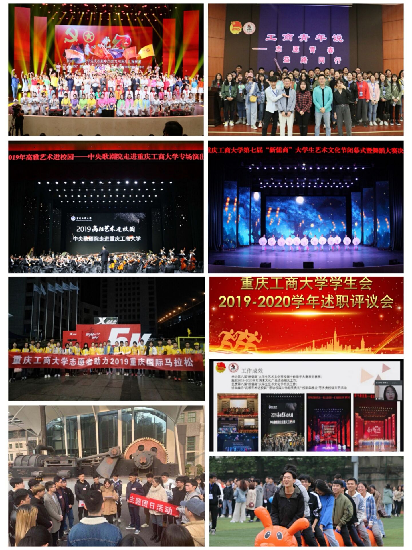 坚持服务同学,助力同学成长成才取得新成果。学生会紧跟学校发展步伐,以五大文化节(科技、社团、义工、艺术、体育)和两大竞赛(“挑战杯” “工商杯”赛事)为抓手,建设有青年特点和学校特色的“新儒商”文化。投身学风建设有举措。一方面配合学校相关职能部门从强化课堂、自修纪律入手,倡议全校学生自觉践行“勤学善思,求真笃行”的工商大学风,开展校院学生会学习科技部座谈会10余次,征集全校同学学习需求,为学风建设提供资料;另一方面围绕专业特色开展丰富多彩的第二课堂活动,推动“青春工商大”APP上线第二课堂学分认证版块,引导同学把专业知识、技能和科研、文体活动相结合。近两年来,有超过4万人次的学生积极主动参加到90多项各类素质拓展活动中;有近1200人次参加了“挑战杯”赛事,获国家级奖项3项,市级奖项40余项。学生权益维护有实招。通过学生权益座谈会、后勤生活交流会、食堂文明监督岗、“青春工商大”APP团团帮、“青年之声”线上平台等渠道,广泛收集同学意见建议,协助学校职能部门及时回应和有效解决同学们关切的问题。处理维权投诉20余件。多形式服务学生学习生活。通过思想动态调研、考研交流、学习研讨等线下活动,“学霸养成记”“研途有你”等线上平台,服务学生成长发展。积极参与学校民主管理,为学校发展建言献策,在招生就业、学生申诉等事宜上选派学生代表参加,充分表达学生意愿。校园文化建设有实效。举办“工商杯”大学生辩论赛70余场,为我校热爱辩论、勇于思辨的青年学生提供展示自我、表现自我、超越自我的平台,吸引近1500余名师生参与观看;举办校园“十佳歌手”“舞蹈大赛”“朗诵大赛”“戏剧大赛”“器乐大赛”共计80余场,推动营造健康高雅的校园文化,吸引近3000余名师生参与观看;举办“新儒商科技论坛”“龙脊书香读书分享会”“工商青年说”等品牌学生活动40余场,分享读书心得、青春故事和人生梦想,吸引3000余名师生参与观看。实践服务有成果。组织志愿者服务31个城乡社区青少年之家、16个敬老院、20个助残基地,为全国志愿服务项目大赛、军博会、抢险救灾等提供志愿服务,志愿服务事迹被《中国青年报》关注和报道;积极响应团中央、团市委号召,组织广大同学踊跃投身社会实践基地、城乡社区市民学校等广泛开展“三下乡”活动;5支团队受国家级表彰,50余个团队和个人受重庆市表彰,社会实践受到《光明日报》《人民日报》《中国教育报》等媒体报道。