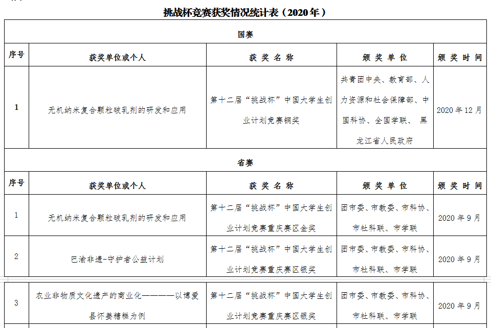 经国赛终审评定,我校环境与资源学院研究生石雪林同学的作品《无机纳米复合颗粒破乳剂的研发和应用》(指导教师:蒋光明)荣获“全国铜奖”。同时我校在重庆赛区中获金奖1项、银奖3项、铜奖6项。
