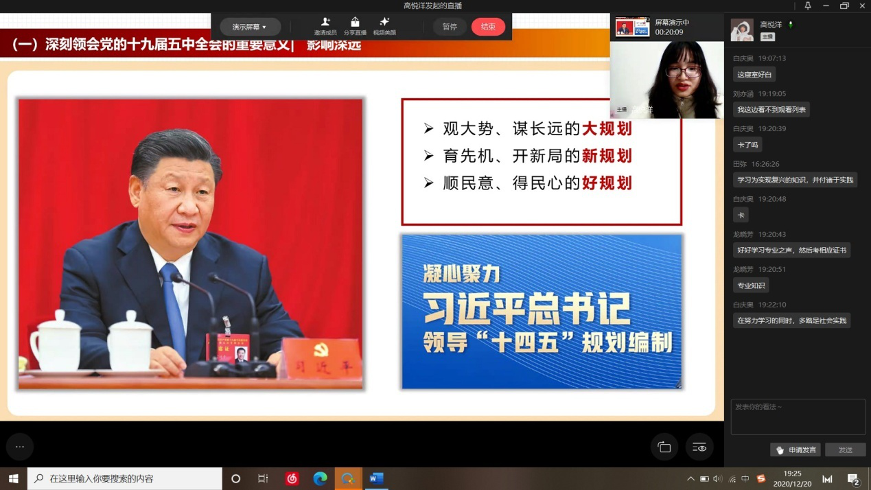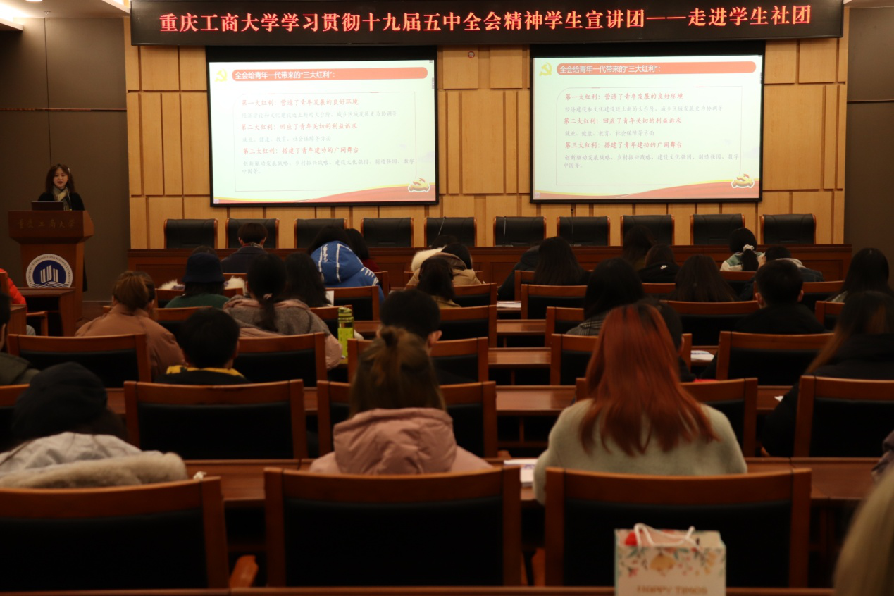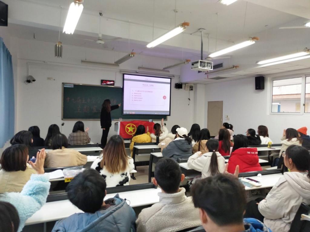 学生宣讲团成员、校级五四红旗团支部团支书田弥在会计学院2018级会计四支部宣讲党的十九届五中全会精神。她表示,青年是勇于奋斗的一代,新时代的发展与青年成长周期环环相扣,要找准切入点,以“成渝地区双城经济圈”建设为平台,努力学习,开拓创新,争做新时代有为青年。