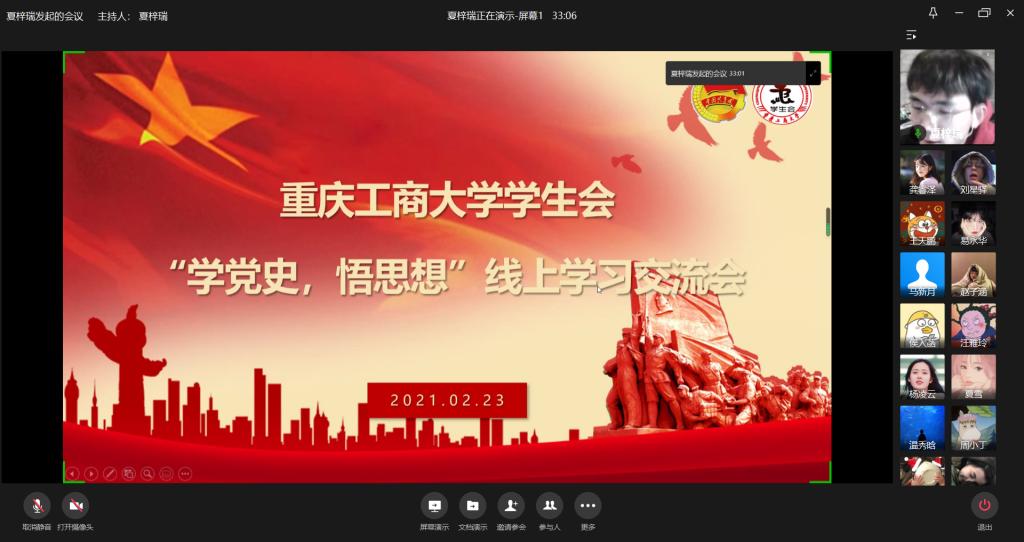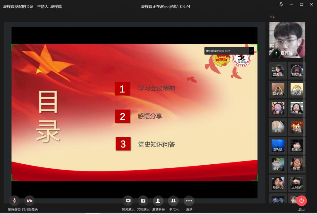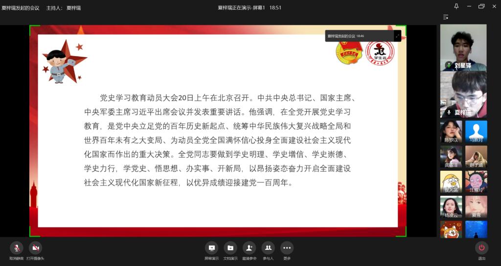 为学习习近平总书记在党史学习教育动员大会上的重要讲话,我校学生会于2月23日通过企业微信平台开展“学党史,悟思想”线上学习交流会。本次线上主题学习交流会由校学生会主席团成员夏梓瑞主持,20余名学生会成员线上共同参与。