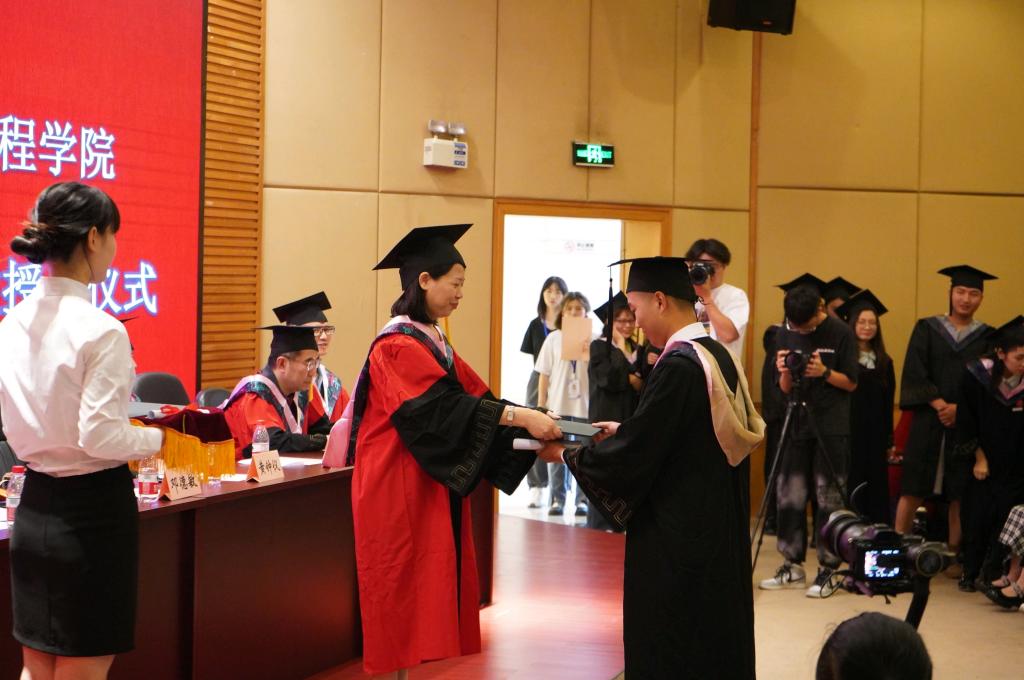 副院长詹川宣读乐鱼在线登录2021届毕业生学位授予决定文件。黄钟仪为学子们一一拨穗,颁发学位证,并与大家合影留念。