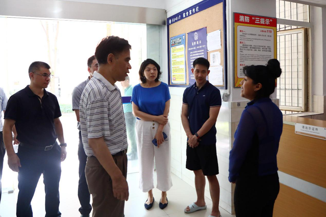 7月23日上午,学校党委书记李志雄、副校长李敬带领党政办公室、党委宣传部、学工部、保卫部、国际合作与交流处、后勤处、工会等相关部门负责人先后到学校厚德楼、保卫处、兰园食堂、兰花湖片区、留学生公寓、南区学生公寓、中干值班室等慰问暑期留校师生,与他们亲切交流、赠送慰问品并检查校园暑期安全工作。