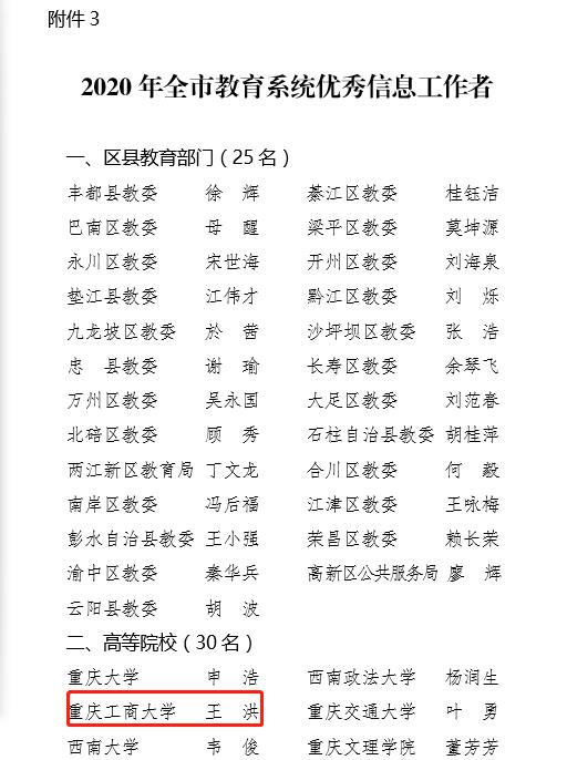 近日,重庆市教育委员会公布了《关于2020年教育信息工作情况的通报》,我校在全市高校信息工作中得分排名第三,被评为重庆市教育信息工作先进单位,党政办王洪同志被评为重庆市教育系统优秀信息工作者。