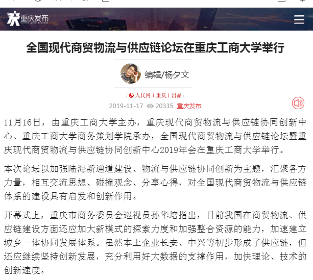 此次会议邀请政产学各界人士共聚一堂,探讨与交流商贸物流、供应链理论与实践,助力区域经济转型和产业升级,为重庆现代商贸物流与供应链协同发展探索了新方向,也为重庆现代商贸物流与供应链协同创新中心的发展目标、工作任务、实施路径等提出了宝贵建议。