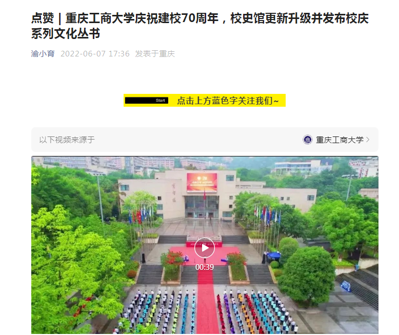 近日,重庆日报、华龙网等媒体报道我校庆祝建校70周年系列活动。6月7日,重庆日报微信公众号“渝小育”以“点赞 | 乐鱼在线登录庆祝建校70周年,校史馆更新升级并发布校庆系列文化丛书”为题报道我校建校70周年升国旗仪式和校史馆更新升级开馆。6月7日,华龙网-新重庆客户端以“乐鱼在线登录庆祝建校70周年升国旗仪式隆重举行”为题报道我校建校70周年升国旗仪式。6月8日,重庆日报客户端以“70年前教学科研用具长啥样 乐鱼在线登录校史馆展出多件‘老古董’”为题报道我校校史馆更新升级。