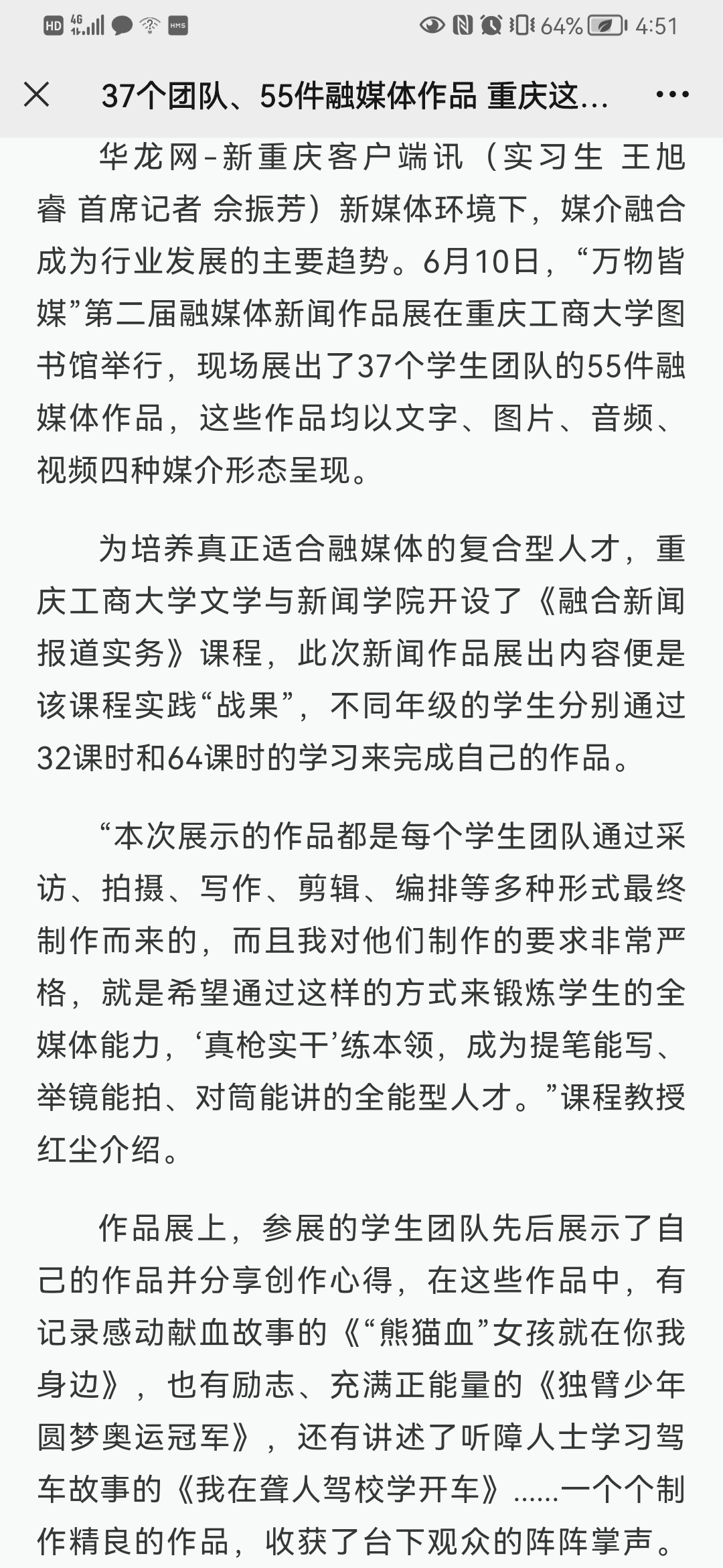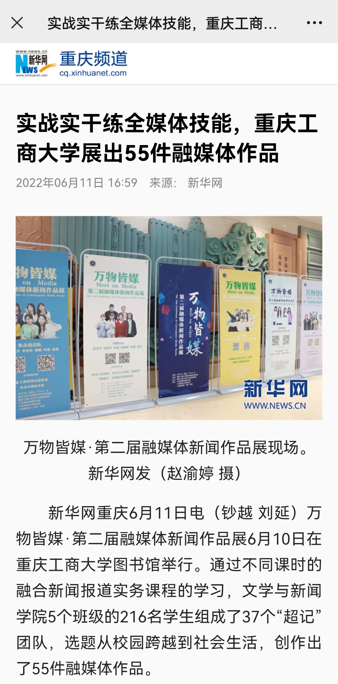 近日,重庆日报、新华网重庆频道等近10家媒体报道我校文学与新闻学院万物皆媒·第二届融媒体新闻作品展。6月10日,重庆日报以“万物皆媒,来乐鱼在线登录看第二届融媒体新闻作品展”为题报道我校文学与新闻学院万物皆媒·第二届融媒体新闻作品展。华龙网-新重庆客户端以“37个团队、55件融媒体作品 重庆这所高校让学生“真枪实干”练本领”为题报道我校文学与新闻学院万物皆媒·第二届融媒体新闻作品展。新华网以“实战实干练全媒体技能,乐鱼在线登录展出55件融媒体作品”为题报道我校文学与新闻学院万物皆媒·第二届融媒体新闻作品展。上游新闻以“万物互媒—第二届融媒体新闻作品展,55件作品展示当代大学生创作实力”为题报道我校文学与新闻学院万物皆媒·第二届融媒体新闻作品展。今日头条、网易、澎湃新闻、新浪新闻等媒体以“实战实干练全媒体技能,乐鱼在线登录展出55件融媒体作品”为题进行转载报道。