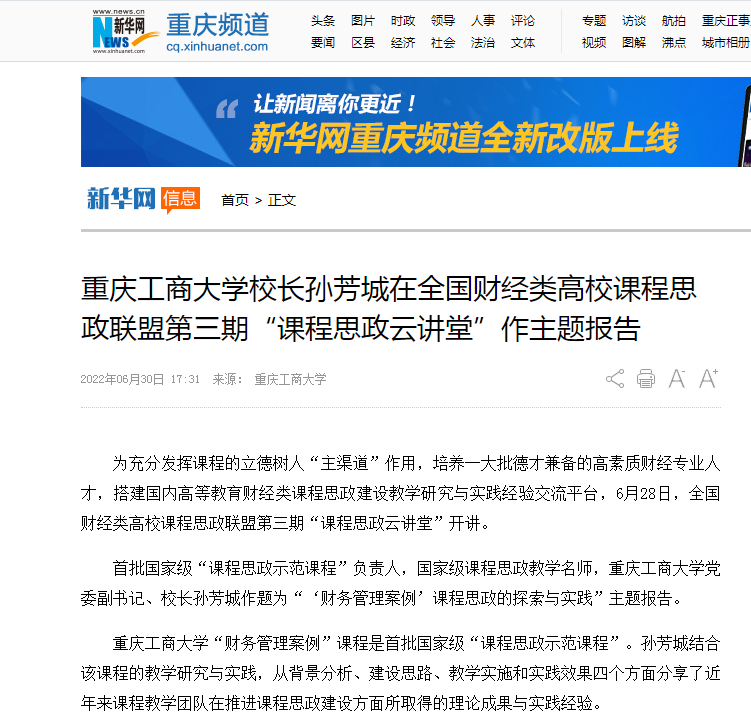 新华网报道我校校长孙芳城在全国财经类高校课程思政联盟第三期“课程思政云讲堂”作主题报告