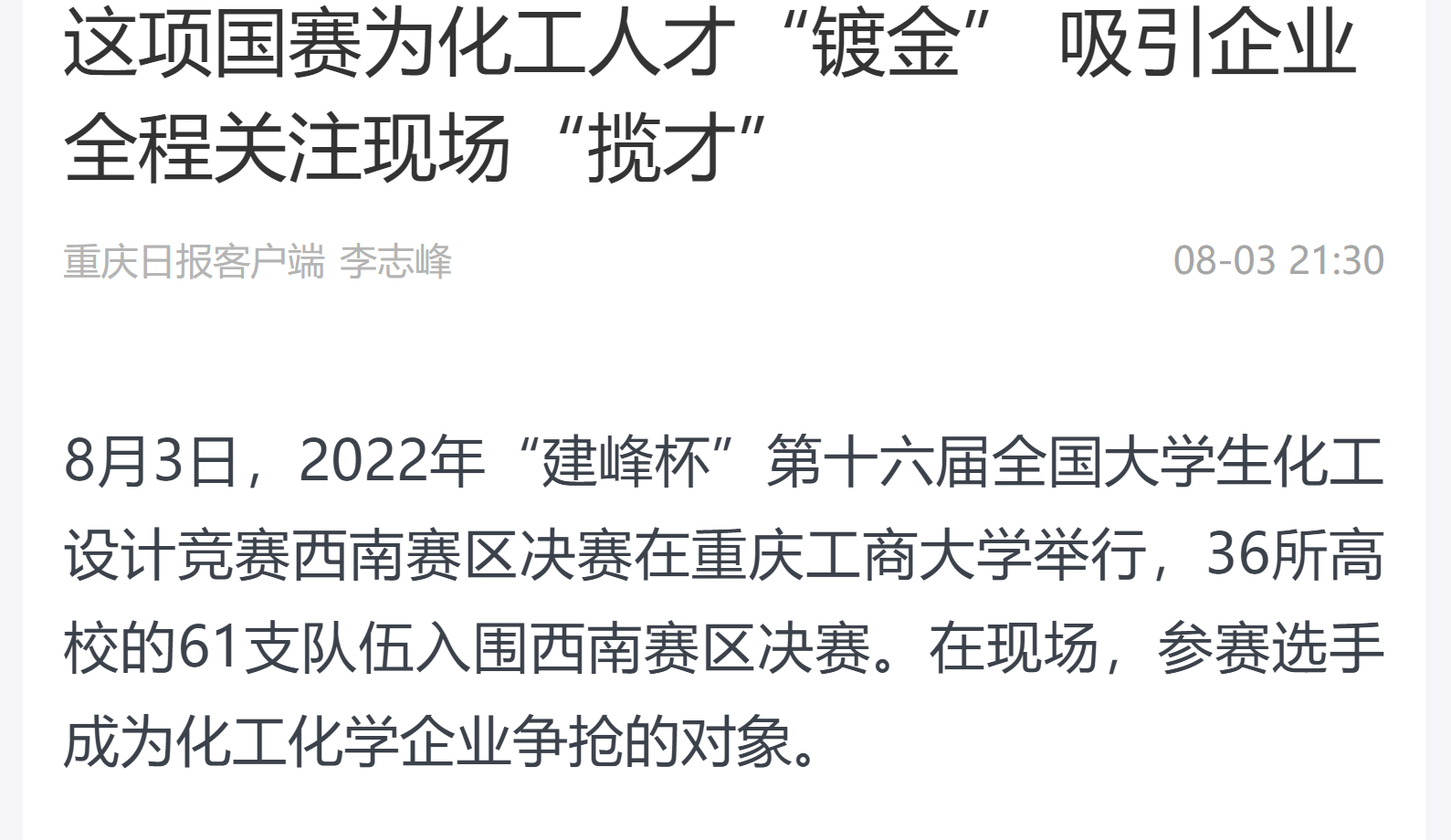 重庆日报报道我校承办2022年“建峰杯”第十六届全国大学生化工设计竞赛西南赛区决赛