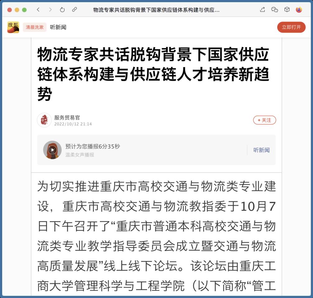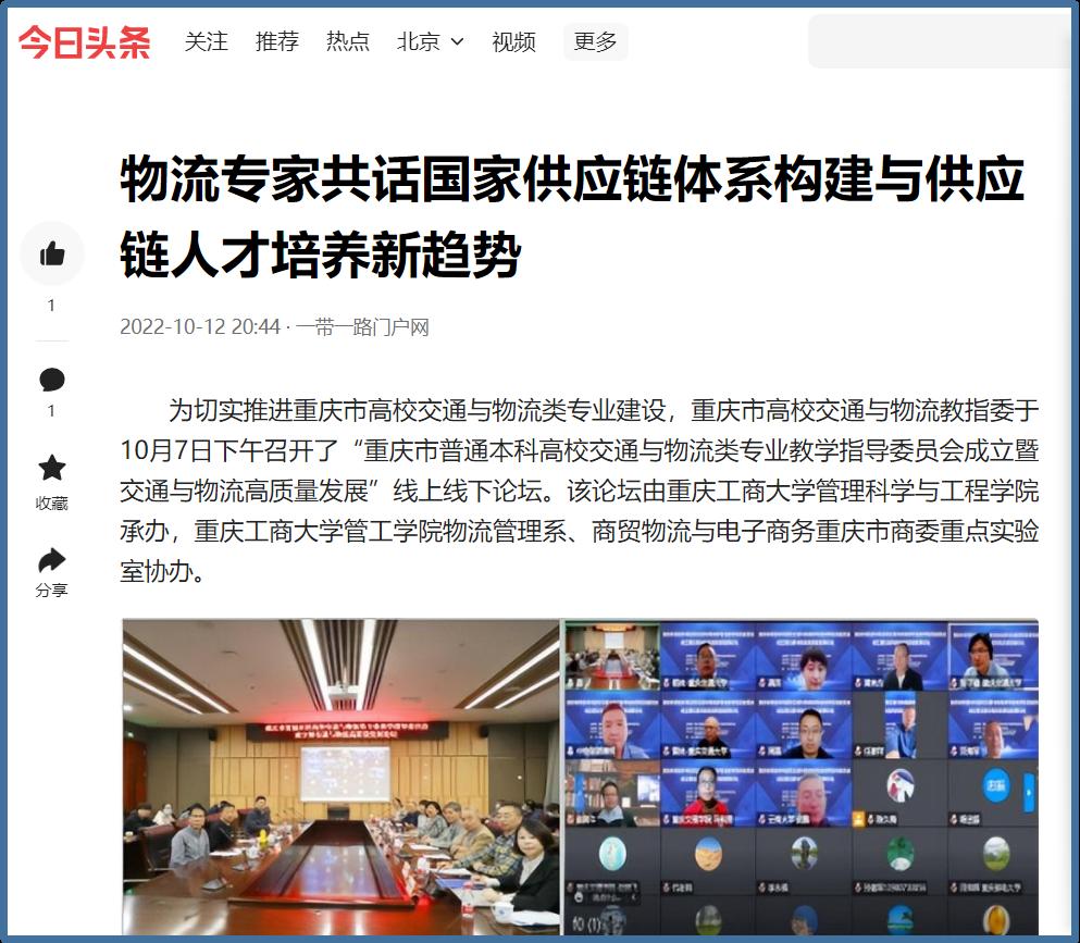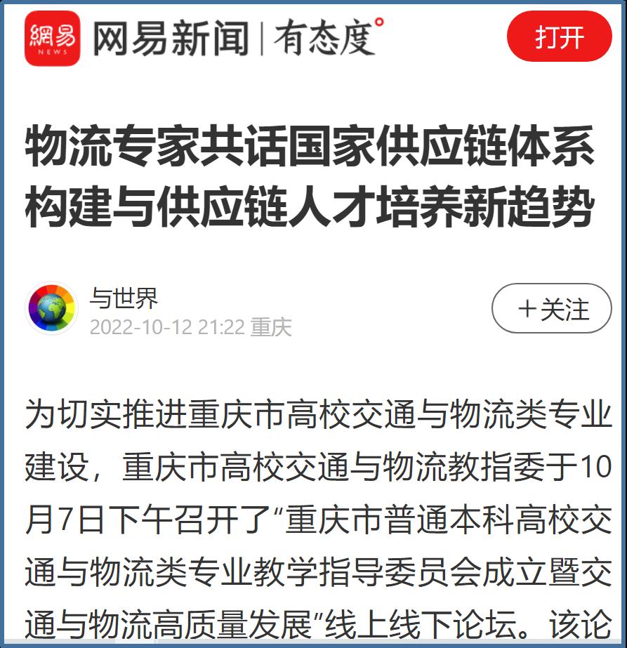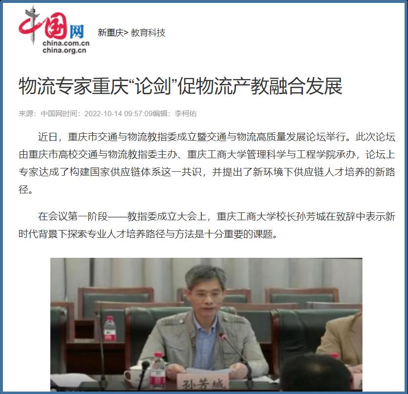 近日,中国网、工人日报、华龙网、今日头条、百度新闻、网易新闻、搜狐新闻等多家主流媒体聚焦交通与物流教指委成立、国家供应链体系构建、供应链人才培养新趋势等内容,对我校成功举办“重庆市交通与物流教指委成立暨交通与物流高质量发展论坛”进行广泛报道。成立大会上,乐鱼在线登录校长孙芳城和市教委高教处处长蒋云芳致辞,高教学会秘书长余志祥宣读委员名单。论坛上教育部高校物流教指委主任黄有方、秘书长郭肇明、中国物流学会会长任豪祥、重庆市交通与物流教指委主任龚英、副主任雷林、副主任付启敏发表主旨演讲。圆桌会议上龚英、提出了工作计划,张军主任、冯利朋院长、陈坚副院长等就各自学校的一流专业经验进行了分享,其他委员为教指委的发展积极建言献策。会议由重庆市交通与物流教指委秘书长陈久梅和管理科学与工程学院院长黄钟仪副主任主持。来自教指委的委员以及全国各地物流本科院校的老师、行业协会等70余人参加本次论坛。