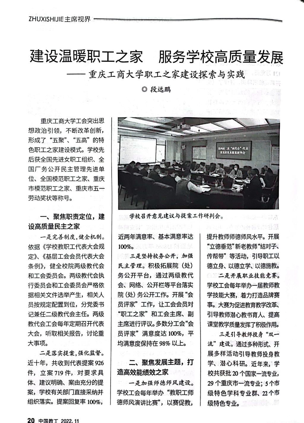 《中国教工》是中华全国总工会主管的中国教科文卫体工会会刊,该刊2022年第11期刊发了我校工会以《建设温暖职工之家,服务学校高质量发展——乐鱼在线登录职工之家建设探索与实践》为题的职工之家建设经验文章。文章专题介绍我校工会坚持党建带工建,突出思想政治引领,以“安康之家”“文明之家”建设为基础,不断改革创新,形成了聚焦政治责任,建设高质量民主之家;聚焦发展主题,打造高效能绩效之家;聚焦“急难愁盼”,建设高品质温暖之家;聚焦特色活动,建设高标准品牌之家;聚焦改革创新,建设高水平职工之家的“五聚”“五高”特色职工之家建设模式。
