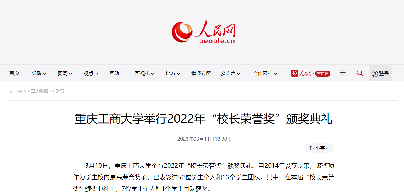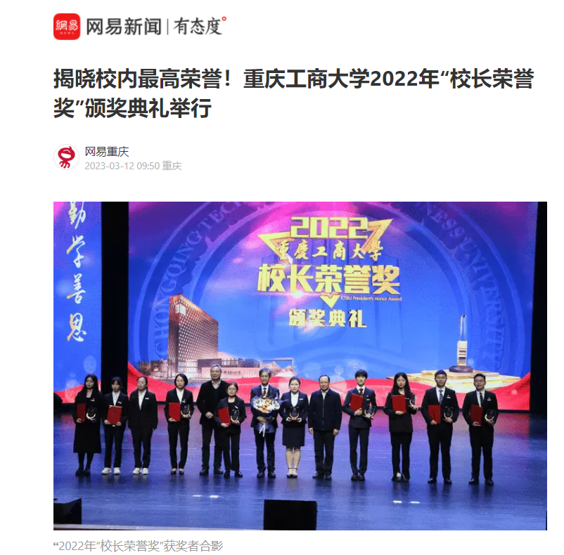 3月10日下午,学校在南岸校区剧场举行2022年“校长荣誉奖”颁奖典礼。人民网以《乐鱼在线登录举行2022年“校长荣誉奖”颁奖典礼》为题,华龙网、网易新闻以《揭晓校内最高荣誉!乐鱼在线登录2022年“校长荣誉奖”颁奖典礼举行》为题,对颁奖典礼进行广泛报道。